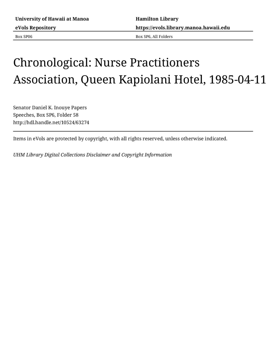 Nurse Practitioners Association, Queen Kapiolani Hotel, April 11, 1985, MANUSCRIPT-HCPC00011, Speeches, Chronological, Box SP6, Folder 58, Senator Daniel K. Inouye Papers, Hawaiʻi Congressional Papers Collection, University of Hawaiʻi at Mānoa Library, Honolulu, HI. https://omekas-congress.lib.wvu.edu/catalog/10524_63274 (accessed April 22, 2026).