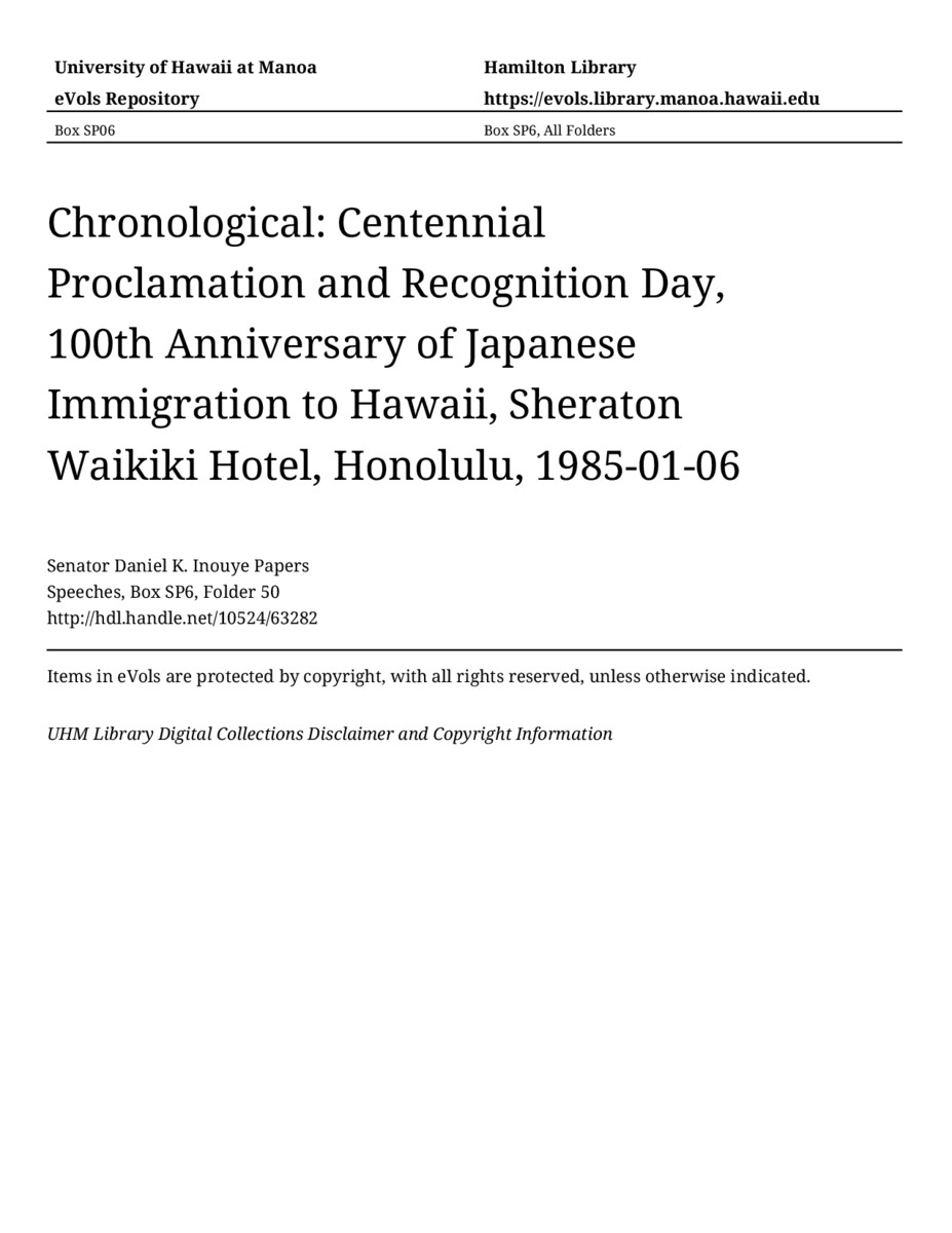 - Centennial Proclamation and Recognition Day, 100th Anniversary of Japanese Immigration to Hawaii, Sheraton Waikiki Hotel, Honolulu