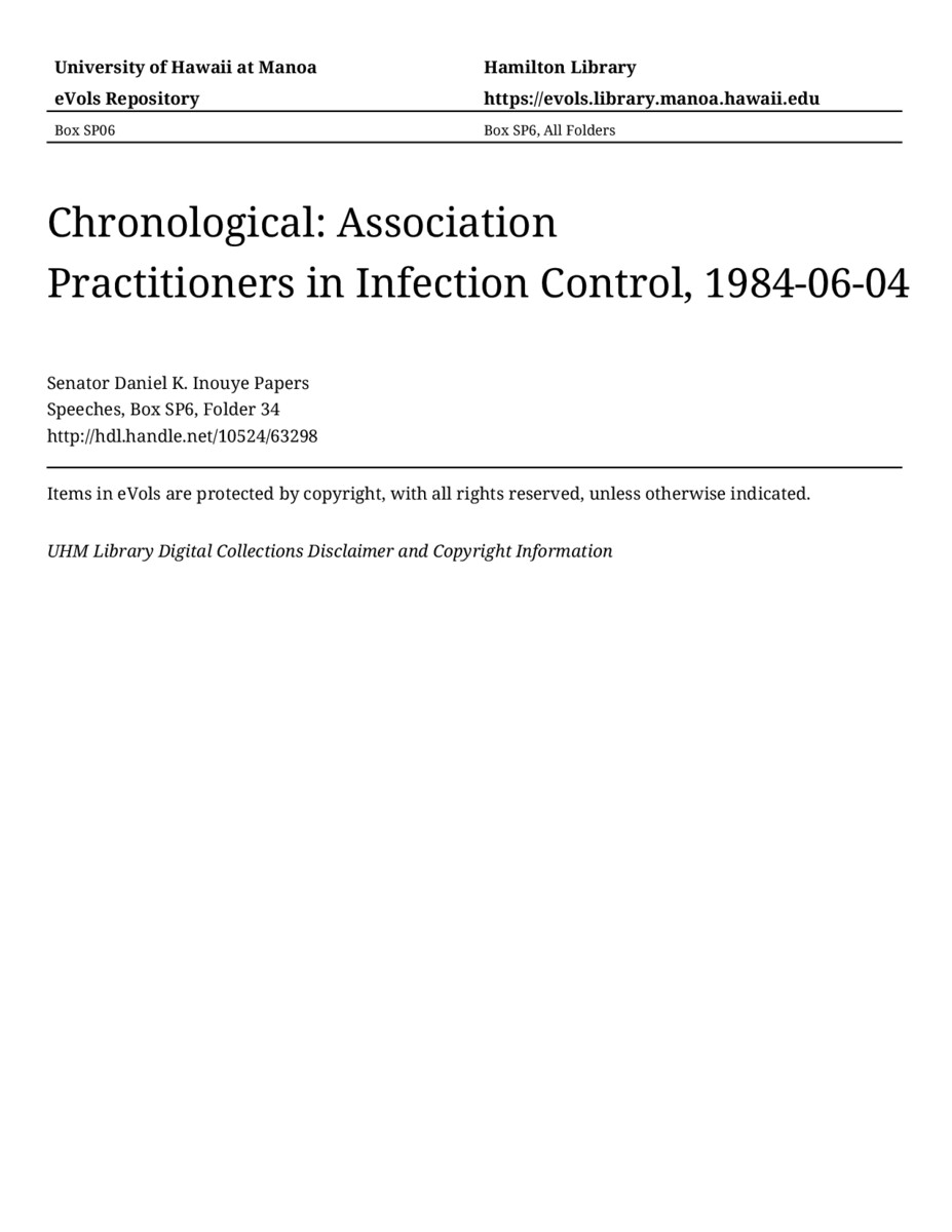 Association Practitioners in Infection Control, June 4, 1984, MANUSCRIPT-HCPC00011, Speeches, Chronological, Box SP6, Folder 34, Senator Daniel K. Inouye Papers, Hawaiʻi Congressional Papers Collection, University of Hawaiʻi at Mānoa Library, Honolulu, HI. https://omekas-congress.lib.wvu.edu/catalog/10524_63298 (accessed April 17, 2026).