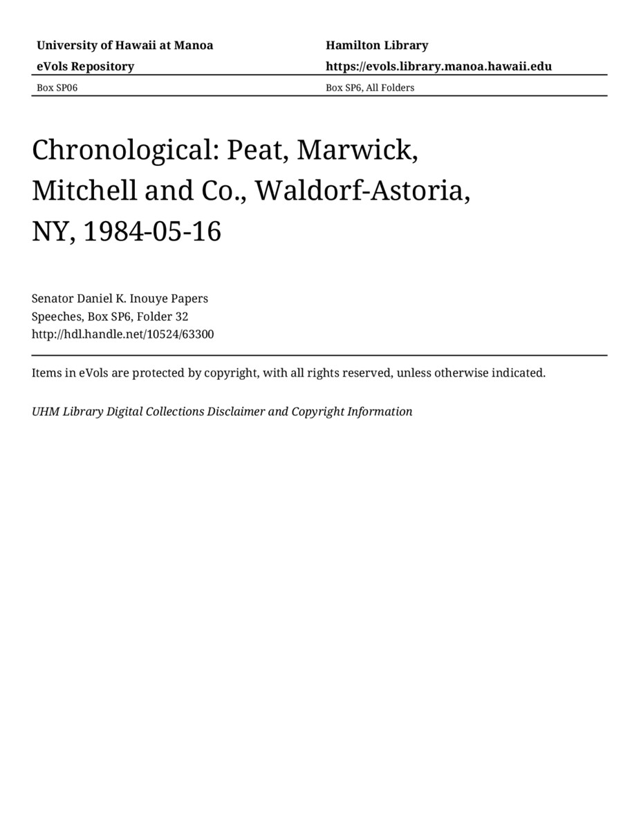 Peat, Marwick, Mitchell and Co., Waldorf-Astoria, NY, May 16, 1984, MANUSCRIPT-HCPC00011, Speeches, Chronological, Box SP6, Folder 32, Senator Daniel K. Inouye Papers, Hawaiʻi Congressional Papers Collection, University of Hawaiʻi at Mānoa Library, Honolulu, HI. https://omekas-congress.lib.wvu.edu/catalog/10524_63300 (accessed April 20, 2026).