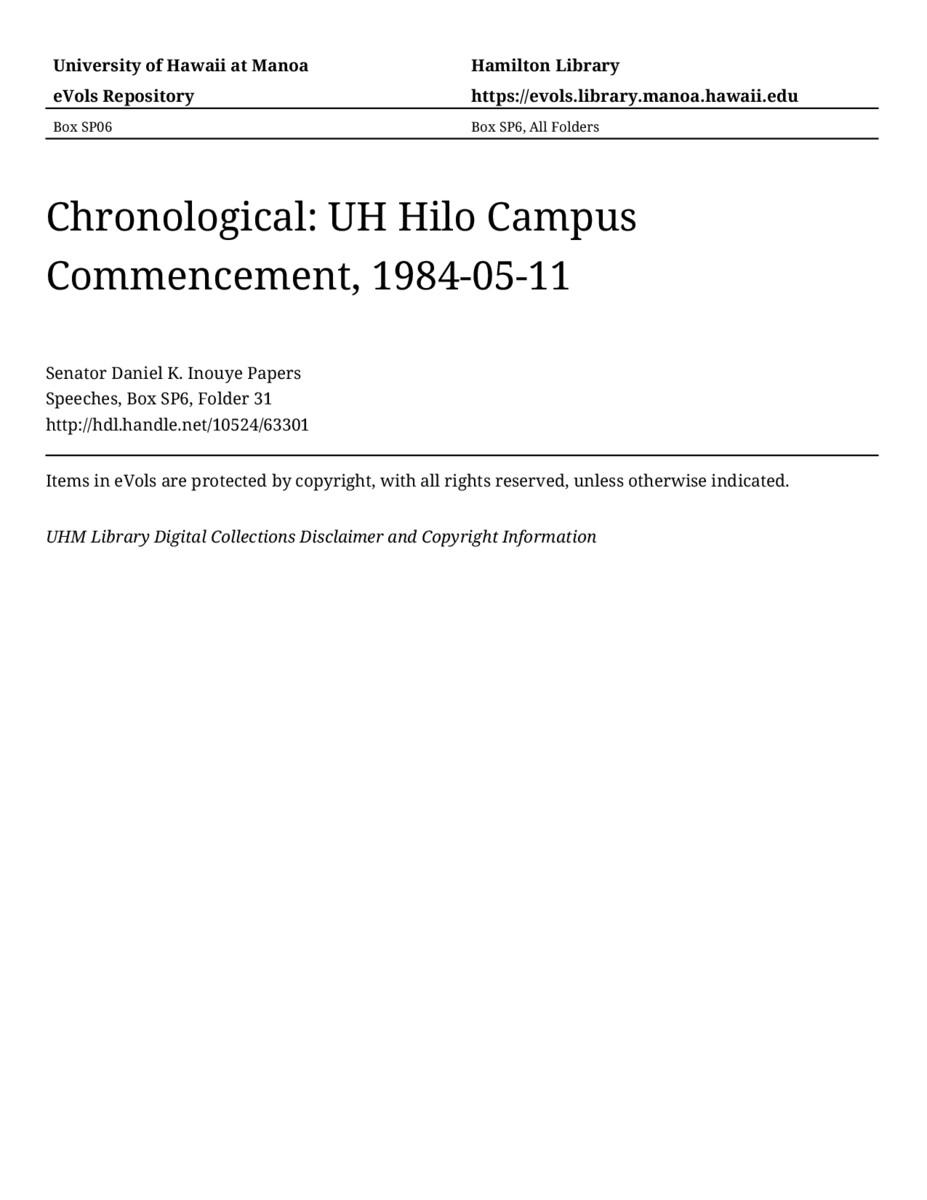 UH Hilo Campus Commencement, May 11, 1984, MANUSCRIPT-HCPC00011, Speeches, Chronological, Box SP6, Folder 31, Senator Daniel K. Inouye Papers, Hawaiʻi Congressional Papers Collection, University of Hawaiʻi at Mānoa Library, Honolulu, HI. https://omekas-congress.lib.wvu.edu/catalog/10524_63301 (accessed April 20, 2026).