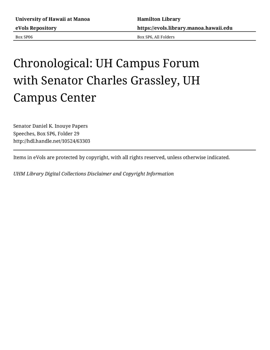 - UH Campus Forum with Senator Charles Grassley, UH Campus Center