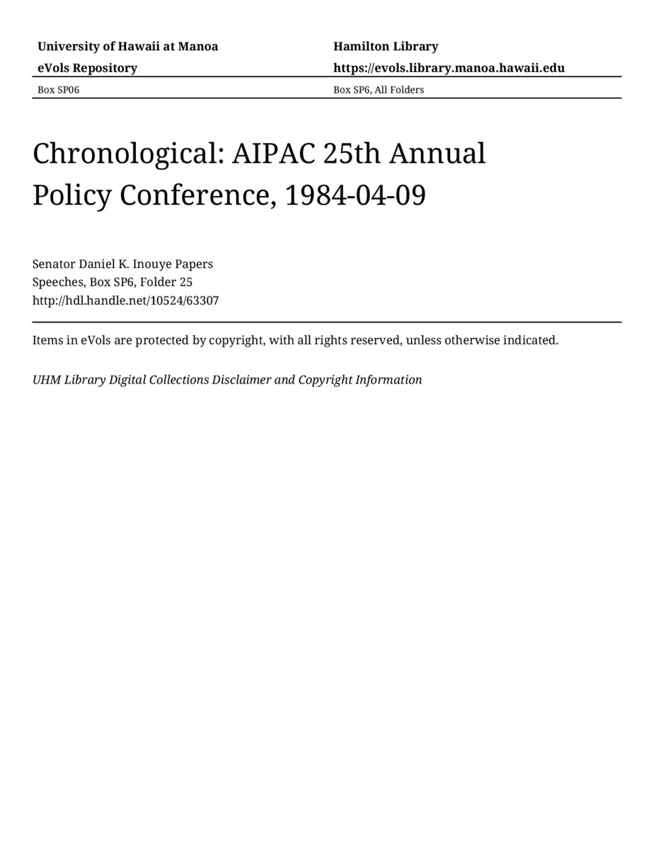 AIPAC 25th Annual Policy Conference, April 9, 1984, MANUSCRIPT-HCPC00011, Speeches, Chronological, Box SP6, Folder 25, Senator Daniel K. Inouye Papers, Hawaiʻi Congressional Papers Collection, University of Hawaiʻi at Mānoa Library, Honolulu, HI. https://omekas-congress.lib.wvu.edu/catalog/10524_63307 (accessed April 17, 2026).
