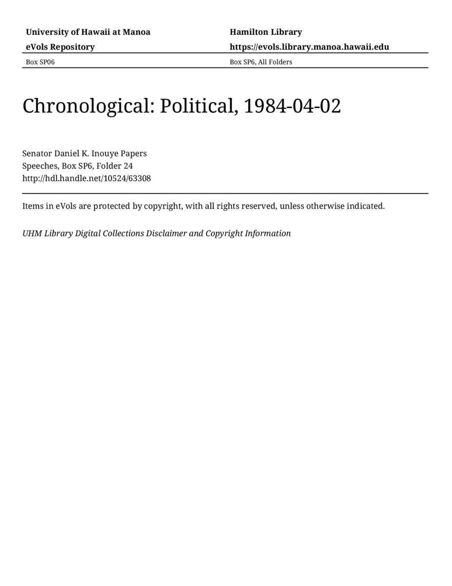 Political, April 2, 1984, MANUSCRIPT-HCPC00011, Speeches, Chronological, Box SP6, Folder 24, Senator Daniel K. Inouye Papers, Hawaiʻi Congressional Papers Collection, University of Hawaiʻi at Mānoa Library, Honolulu, HI. https://omekas-congress.lib.wvu.edu/catalog/10524_63308 (accessed April 17, 2026).