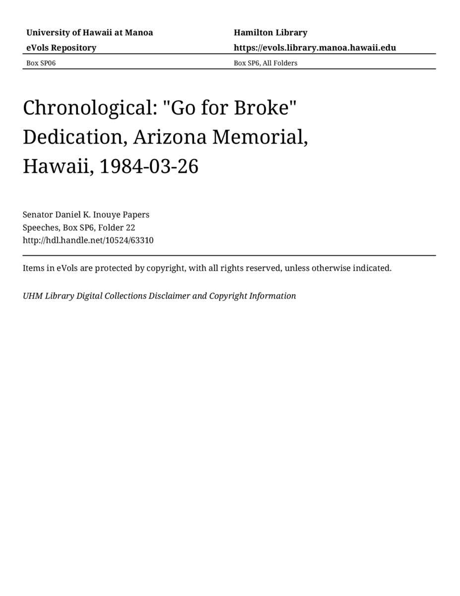 "Go for Broke" Dedication, Arizona Memorial, Hawaii, March 26, 1984, MANUSCRIPT-HCPC00011, Speeches, Chronological, Box SP6, Folder 22, Senator Daniel K. Inouye Papers, Hawaiʻi Congressional Papers Collection, University of Hawaiʻi at Mānoa Library, Honolulu, HI. https://omekas-congress.lib.wvu.edu/catalog/10524_63310 (accessed April 17, 2026).