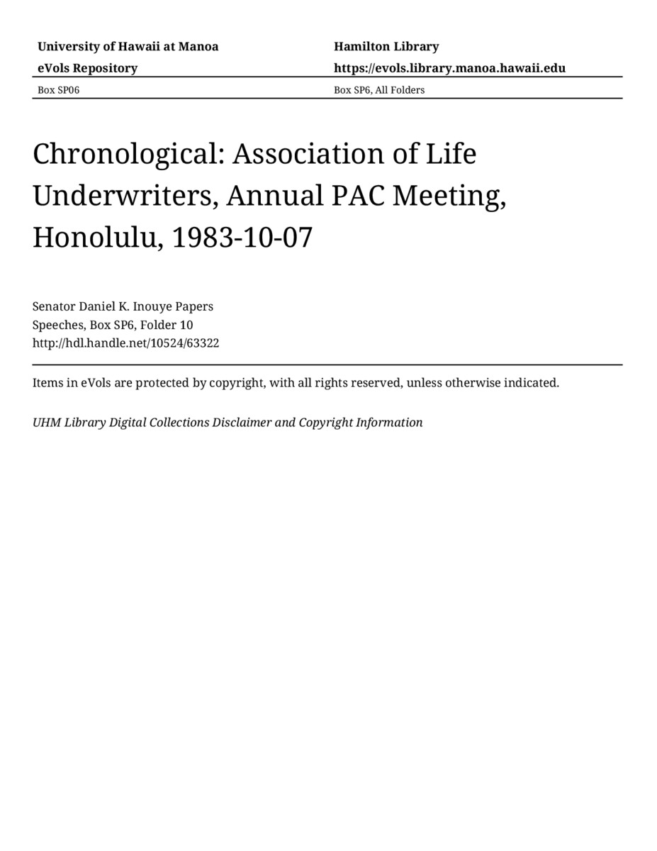 Association of Life Underwriters, Annual PAC Meeting, Honolulu, October 7, 1983, MANUSCRIPT-HCPC00011, Speeches, Chronological, Box SP6, Folder 10, Senator Daniel K. Inouye Papers, Hawaiʻi Congressional Papers Collection, University of Hawaiʻi at Mānoa Library, Honolulu, HI. https://omekas-congress.lib.wvu.edu/catalog/10524_63322 (accessed April 19, 2026).
