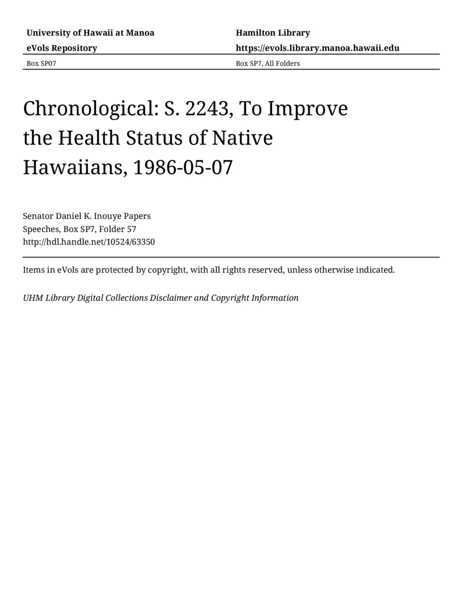 S. 2243, To Improve the Health Status of Native Hawaiians, May 7, 1986, MANUSCRIPT-HCPC00011, Speeches, Chronological, Box SP7, Folder 57, Senator Daniel K. Inouye Papers, Hawaiʻi Congressional Papers Collection, University of Hawaiʻi at Mānoa Library, Honolulu, HI. https://omekas-congress.lib.wvu.edu/catalog/10524_63350 (accessed April 20, 2026).
