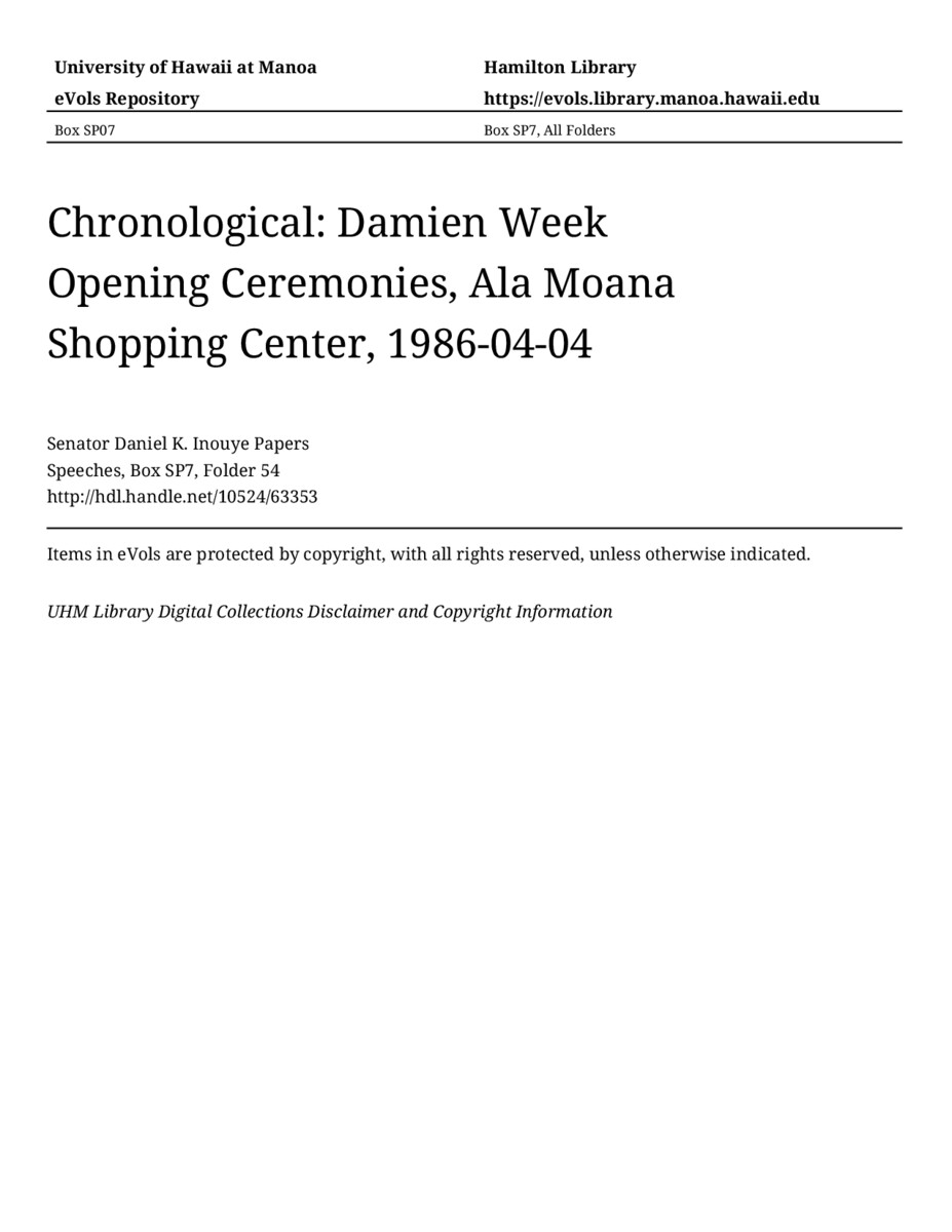 Damien Week Opening Ceremonies, Ala Moana Shopping Center, April 4, 1986, MANUSCRIPT-HCPC00011, Speeches, Chronological, Box SP7, Folder 54, Senator Daniel K. Inouye Papers, Hawaiʻi Congressional Papers Collection, University of Hawaiʻi at Mānoa Library, Honolulu, HI. https://omekas-congress.lib.wvu.edu/catalog/10524_63353 (accessed April 21, 2026).