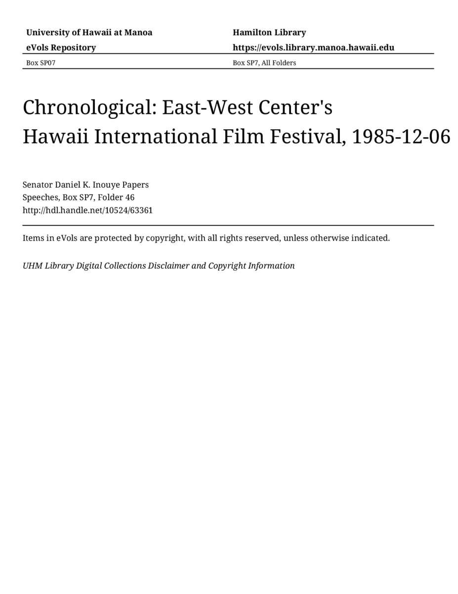 East-West Center's Hawaii International Film Festival, December 6, 1985, MANUSCRIPT-HCPC00011, Speeches, Chronological, Box SP7, Folder 46, Senator Daniel K. Inouye Papers, Hawaiʻi Congressional Papers Collection, University of Hawaiʻi at Mānoa Library, Honolulu, HI. https://omekas-congress.lib.wvu.edu/catalog/10524_63361 (accessed April 18, 2026).