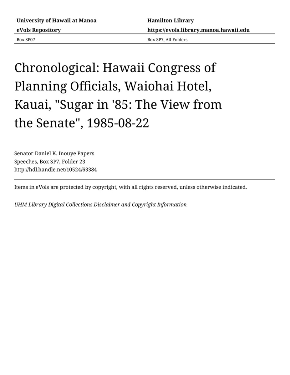 Hawaii Congress of Planning Officials, Waiohai Hotel, Kauai, "Sugar in '85: The View from the Senate"