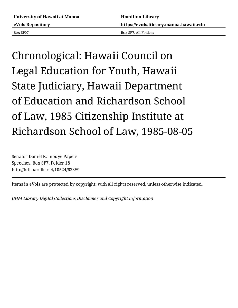 Hawaii Council on Legal Education for Youth, Hawaii State Judiciary, Hawaii Department of Education and Richardson School of Law, 1985 Citizenship Institute at Richardson School of Law, August 5, 1985, MANUSCRIPT-HCPC00011, Speeches, Chronological, Box SP7, Folder 18, Senator Daniel K. Inouye Papers, Hawaiʻi Congressional Papers Collection, University of Hawaiʻi at Mānoa Library, Honolulu, HI. https://omekas-congress.lib.wvu.edu/catalog/10524_63389 (accessed April 21, 2026).