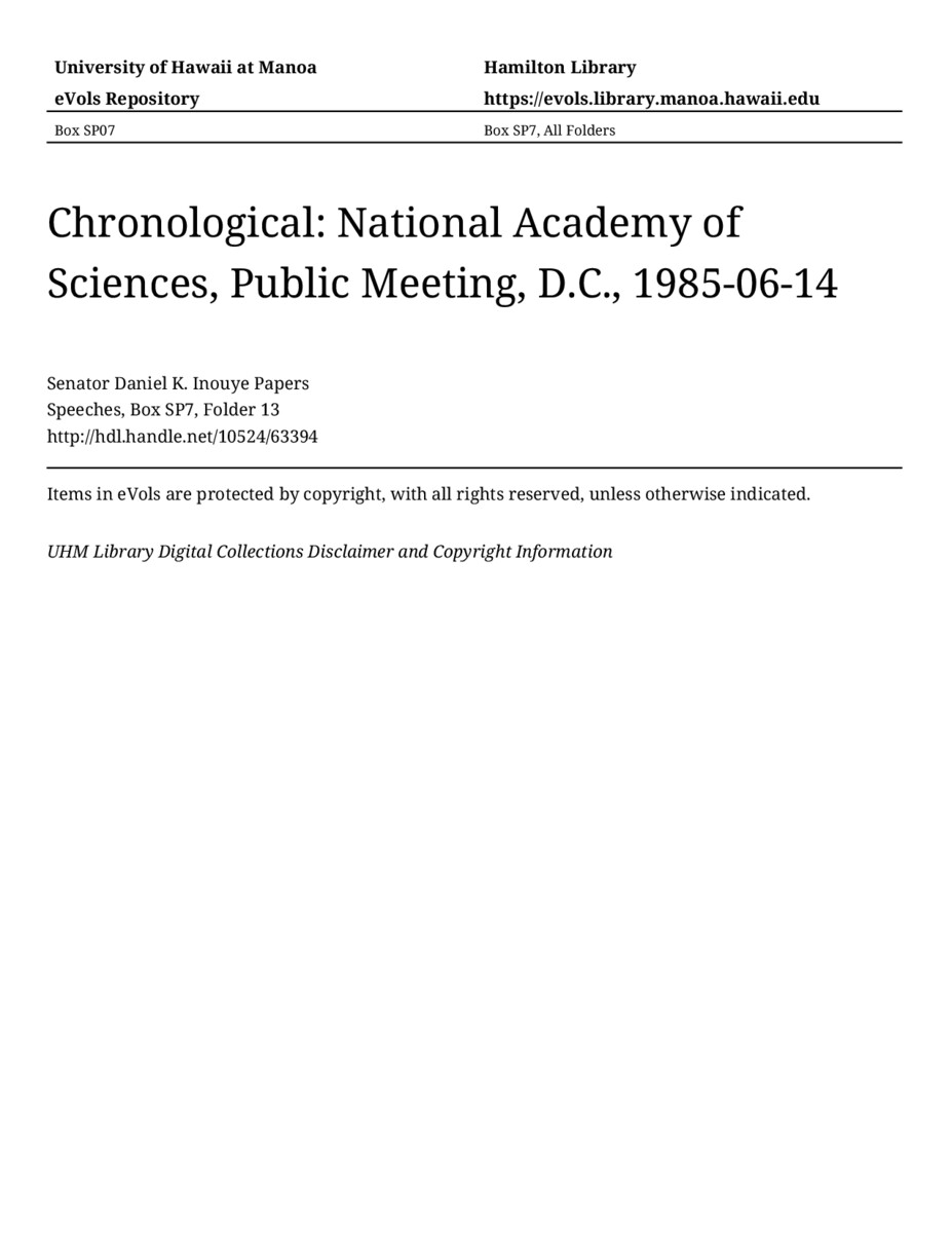 National Academy of Sciences, Public Meeting, D.C., June 14, 1985, MANUSCRIPT-HCPC00011, Speeches, Chronological, Box SP7, Folder 13, Senator Daniel K. Inouye Papers, Hawaiʻi Congressional Papers Collection, University of Hawaiʻi at Mānoa Library, Honolulu, HI. https://omekas-congress.lib.wvu.edu/catalog/10524_63394 (accessed April 25, 2026).