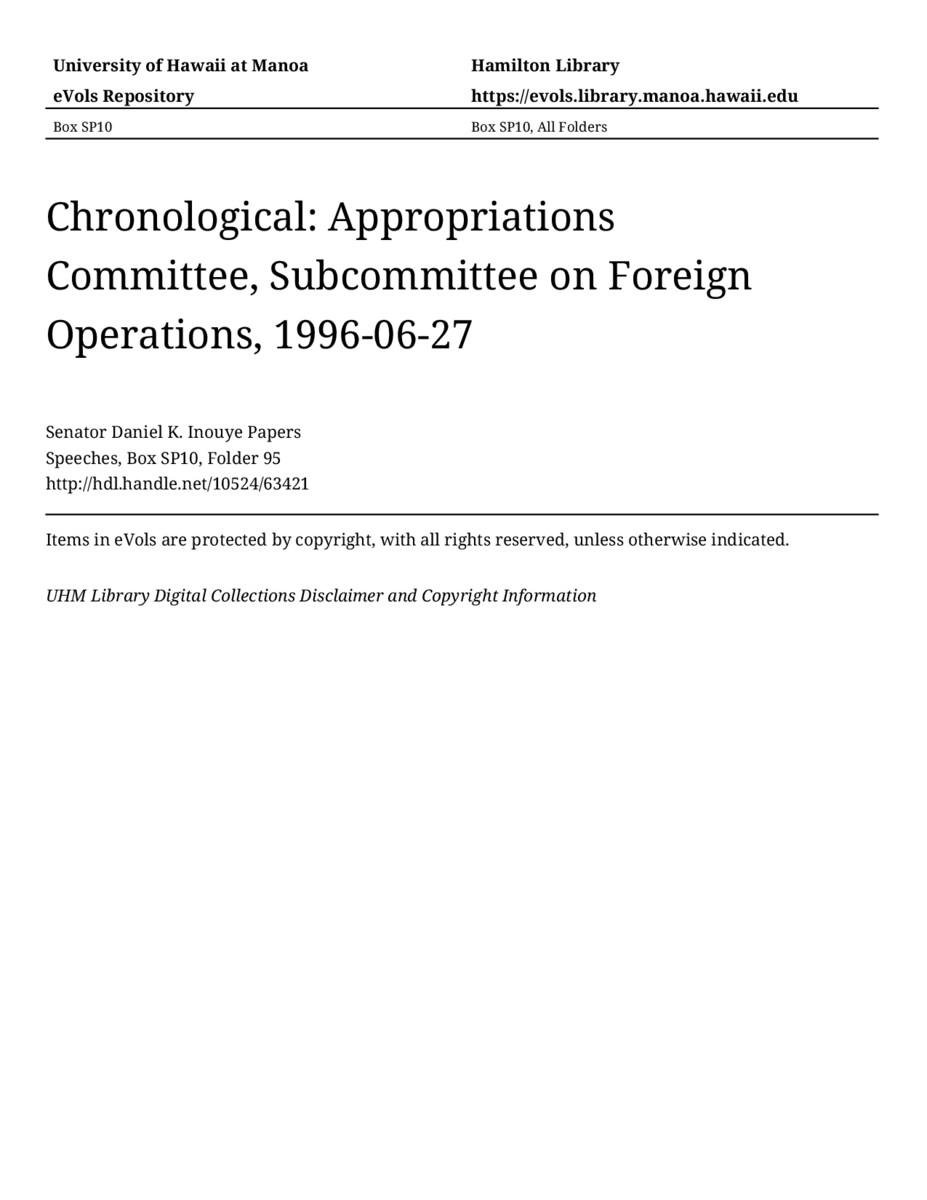 Appropriations Committee, Subcommittee on Foreign Operations, June 27, 1996, MANUSCRIPT-HCPC00011, Speeches, Chronological, Box SP10, Folder 95, Senator Daniel K. Inouye Papers, Hawaiʻi Congressional Papers Collection, University of Hawaiʻi at Mānoa Library, Honolulu, HI. https://omekas-congress.lib.wvu.edu/catalog/10524_63421 (accessed April 19, 2026).