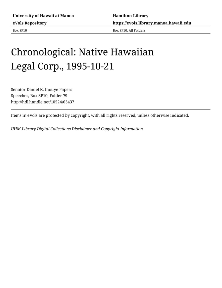 Native Hawaiian Legal Corp., October 21, 1995, MANUSCRIPT-HCPC00011, Speeches, Chronological, Box SP10, Folder 79, Senator Daniel K. Inouye Papers, Hawaiʻi Congressional Papers Collection, University of Hawaiʻi at Mānoa Library, Honolulu, HI. https://omekas-congress.lib.wvu.edu/catalog/10524_63437 (accessed April 16, 2026).