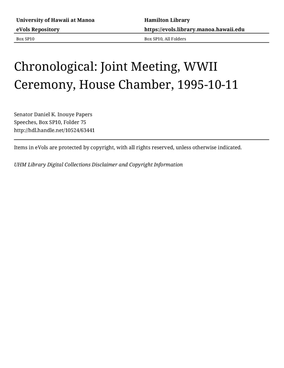 Joint Meeting, WWII Ceremony, House Chamber, October 11, 1995, MANUSCRIPT-HCPC00011, Speeches, Chronological, Box SP10, Folder 75, Senator Daniel K. Inouye Papers, Hawaiʻi Congressional Papers Collection, University of Hawaiʻi at Mānoa Library, Honolulu, HI. https://omekas-congress.lib.wvu.edu/catalog/10524_63441 (accessed April 17, 2026).