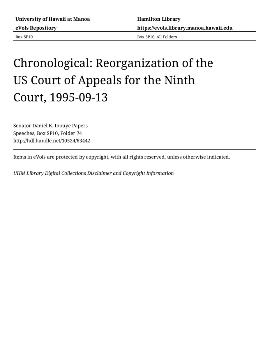 Reorganization of the US Court of Appeals for the Ninth Court, September 13, 1995, MANUSCRIPT-HCPC00011, Speeches, Chronological, Box SP10, Folder 74, Senator Daniel K. Inouye Papers, Hawaiʻi Congressional Papers Collection, University of Hawaiʻi at Mānoa Library, Honolulu, HI. https://omekas-congress.lib.wvu.edu/catalog/10524_63442 (accessed April 17, 2026).