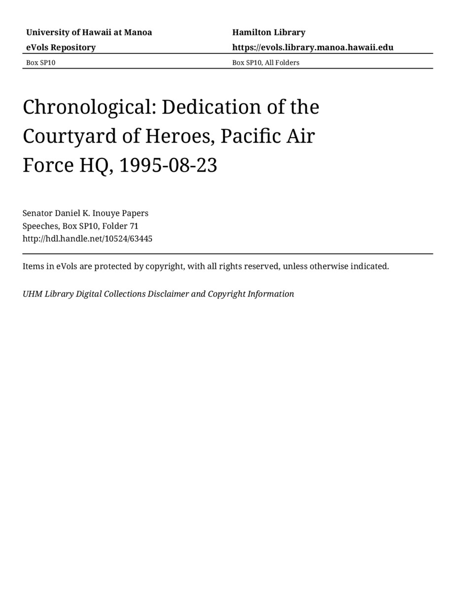 Dedication of the Courtyard of Heroes, Pacific Air Force HQ, August 23, 1995, MANUSCRIPT-HCPC00011, Speeches, Chronological, Box SP10, Folder 71, Senator Daniel K. Inouye Papers, Hawaiʻi Congressional Papers Collection, University of Hawaiʻi at Mānoa Library, Honolulu, HI. https://omekas-congress.lib.wvu.edu/catalog/10524_63445 (accessed April 17, 2026).