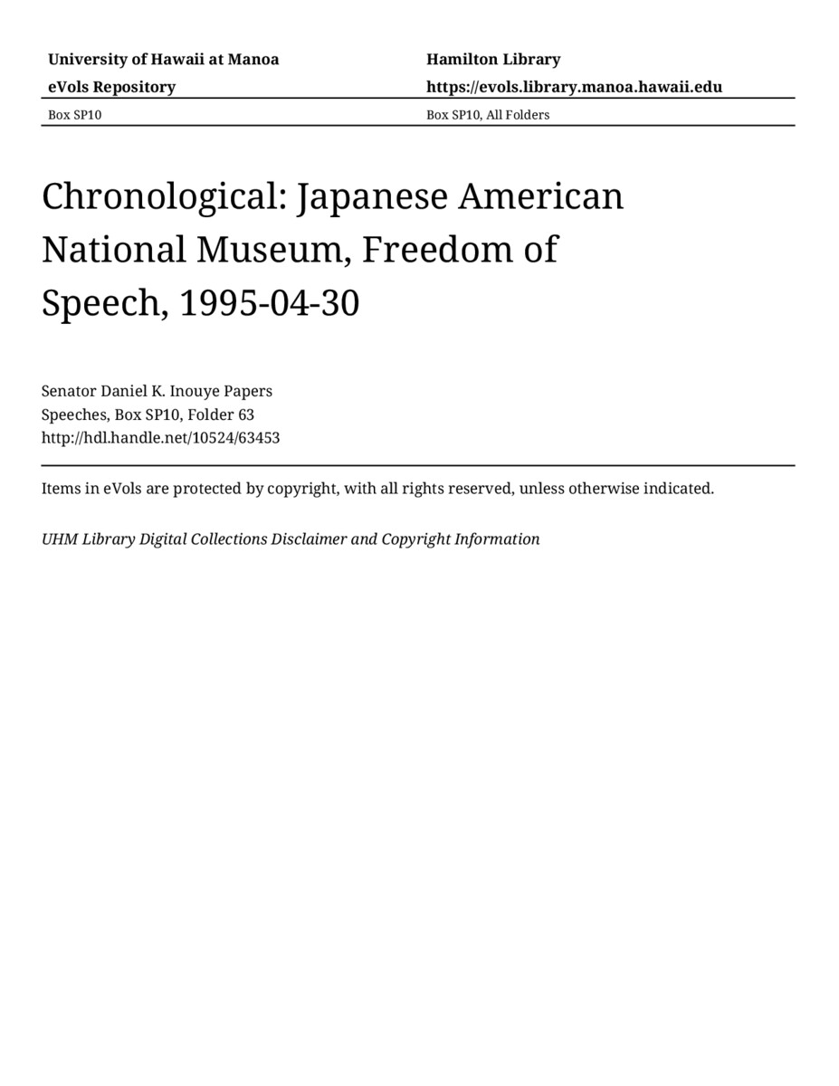 Japanese American National Museum, Freedom of Speech, April 30, 1995, MANUSCRIPT-HCPC00011, Speeches, Chronological, Box SP10, Folder 63, Senator Daniel K. Inouye Papers, Hawaiʻi Congressional Papers Collection, University of Hawaiʻi at Mānoa Library, Honolulu, HI. https://omekas-congress.lib.wvu.edu/catalog/10524_63453 (accessed April 15, 2026).