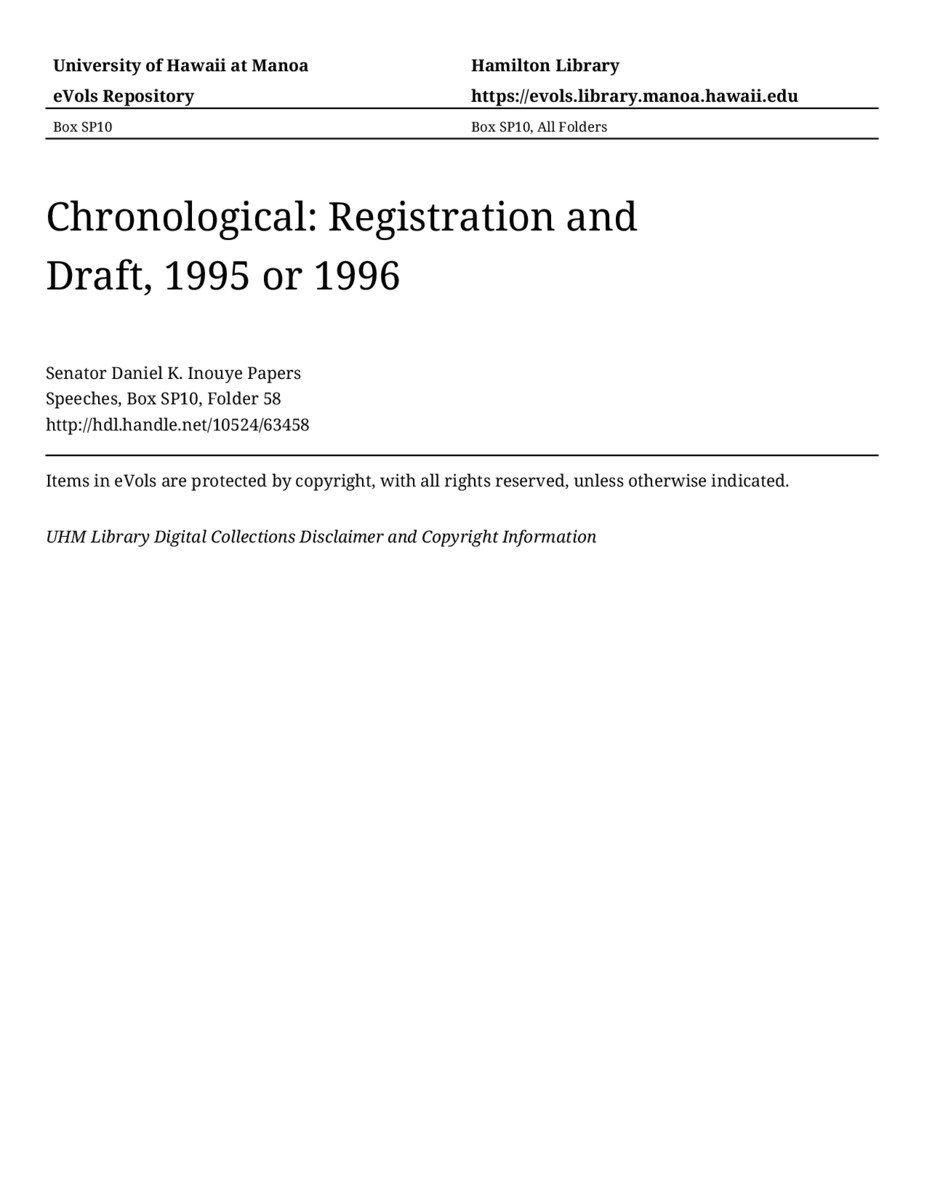 Registration and Draft, 1995 or 1996, 1995 or 1996, MANUSCRIPT-HCPC00011, Speeches, Chronological, Box SP10, Folder 58, Senator Daniel K. Inouye Papers, Hawaiʻi Congressional Papers Collection, University of Hawaiʻi at Mānoa Library, Honolulu, HI. https://omekas-congress.lib.wvu.edu/catalog/10524_63458 (accessed April 20, 2026).