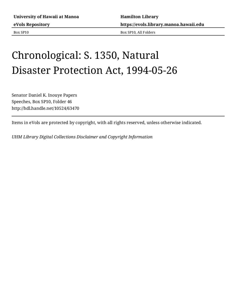 S. 1350, Natural Disaster Protection Act, May 26, 1994, MANUSCRIPT-HCPC00011, Speeches, Chronological, Box SP10, Folder 46, Senator Daniel K. Inouye Papers, Hawaiʻi Congressional Papers Collection, University of Hawaiʻi at Mānoa Library, Honolulu, HI. https://omekas-congress.lib.wvu.edu/catalog/10524_63470 (accessed April 21, 2026).