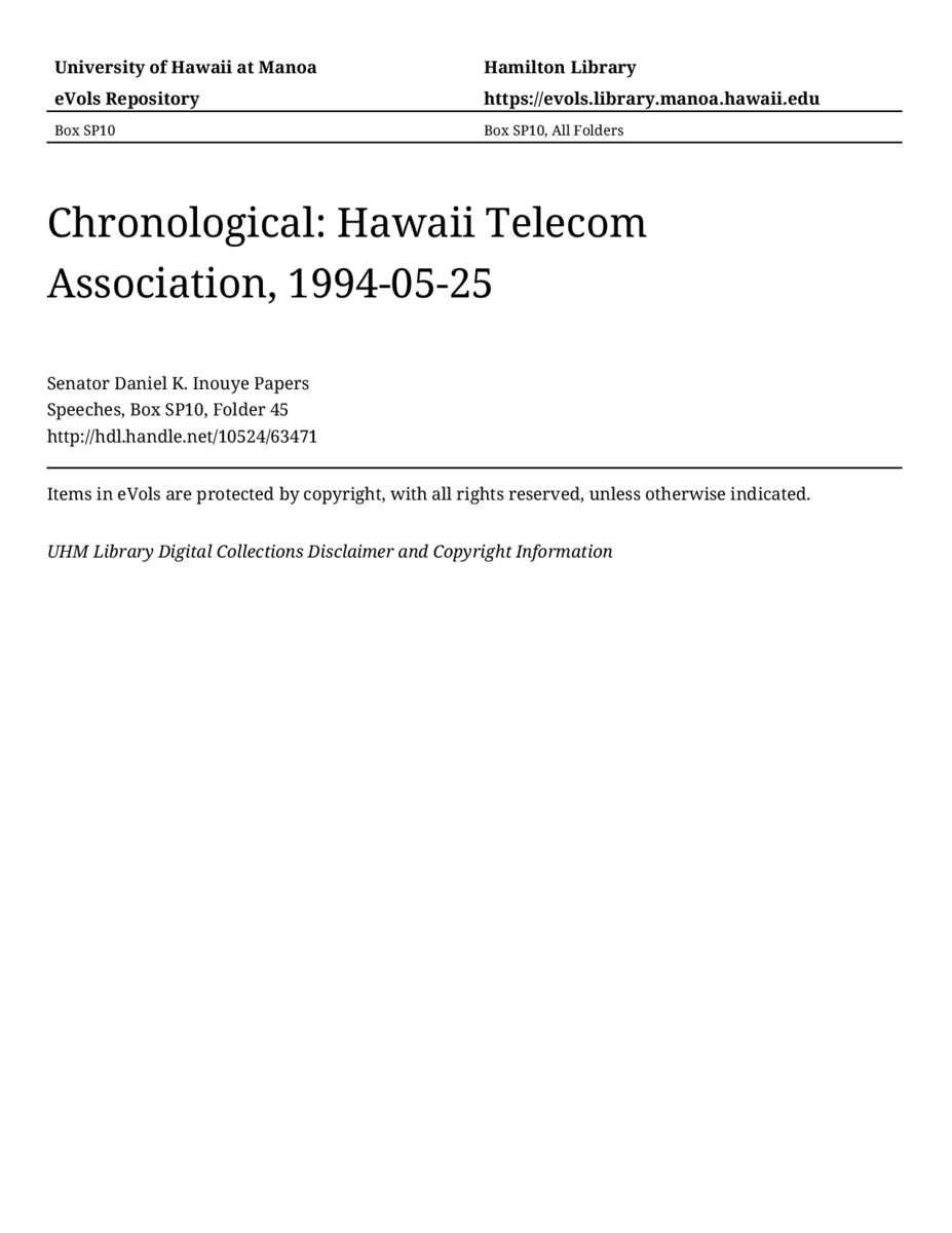 Hawaii Telecom Association, May 25, 1994, MANUSCRIPT-HCPC00011, Speeches, Chronological, Box SP10, Folder 45, Senator Daniel K. Inouye Papers, Hawaiʻi Congressional Papers Collection, University of Hawaiʻi at Mānoa Library, Honolulu, HI. https://omekas-congress.lib.wvu.edu/catalog/10524_63471 (accessed April 09, 2026).