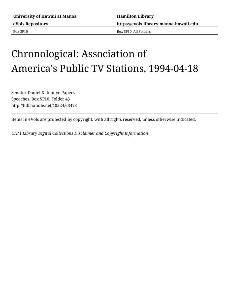Association of America's Public TV Stations, April 18, 1994, MANUSCRIPT-HCPC00011, Speeches, Chronological, Box SP10, Folder 43, Senator Daniel K. Inouye Papers, Hawaiʻi Congressional Papers Collection, University of Hawaiʻi at Mānoa Library, Honolulu, HI. https://omekas-congress.lib.wvu.edu/catalog/10524_63473 (accessed April 09, 2026).