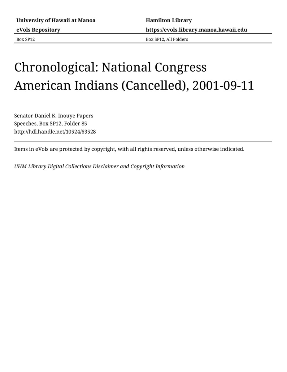 National Congress American Indians (Cancelled), September 11, 2001, MANUSCRIPT-HCPC00011, Speeches, Chronological, Box SP12, Folder 85, Senator Daniel K. Inouye Papers, Hawaiʻi Congressional Papers Collection, University of Hawaiʻi at Mānoa Library, Honolulu, HI. https://omekas-congress.lib.wvu.edu/catalog/10524_63528 (accessed April 12, 2026).
