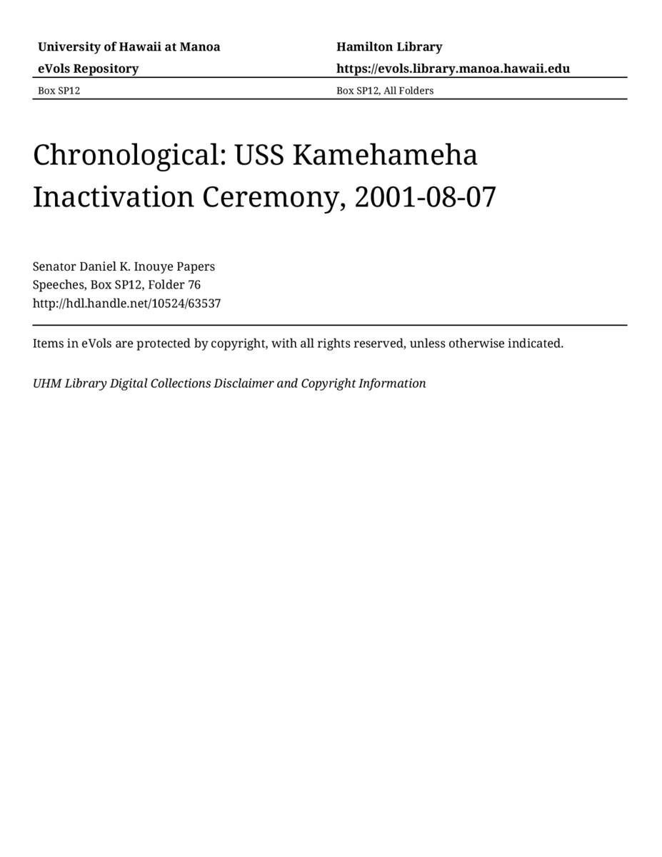 USS Kamehameha Inactivation Ceremony, August 7, 2001, MANUSCRIPT-HCPC00011, Speeches, Chronological, Box SP12, Folder 76, Senator Daniel K. Inouye Papers, Hawaiʻi Congressional Papers Collection, University of Hawaiʻi at Mānoa Library, Honolulu, HI. https://omekas-congress.lib.wvu.edu/catalog/10524_63537 (accessed April 17, 2026).