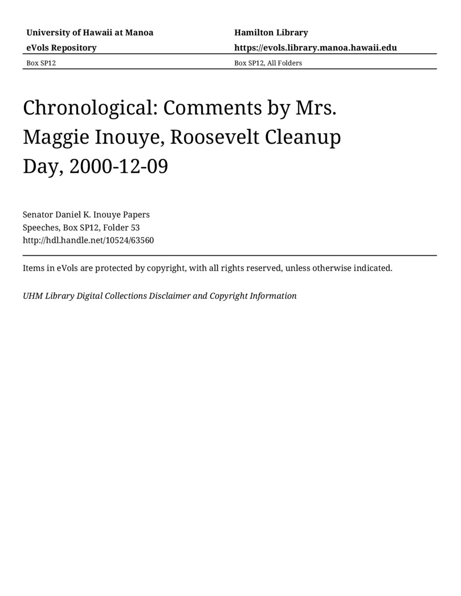 Comments by Mrs. Maggie Inouye, Roosevelt Cleanup Day, December 9, 2000, MANUSCRIPT-HCPC00011, Speeches, Chronological, Box SP12, Folder 53, Senator Daniel K. Inouye Papers, Hawaiʻi Congressional Papers Collection, University of Hawaiʻi at Mānoa Library, Honolulu, HI. https://omekas-congress.lib.wvu.edu/catalog/10524_63560 (accessed April 15, 2026).