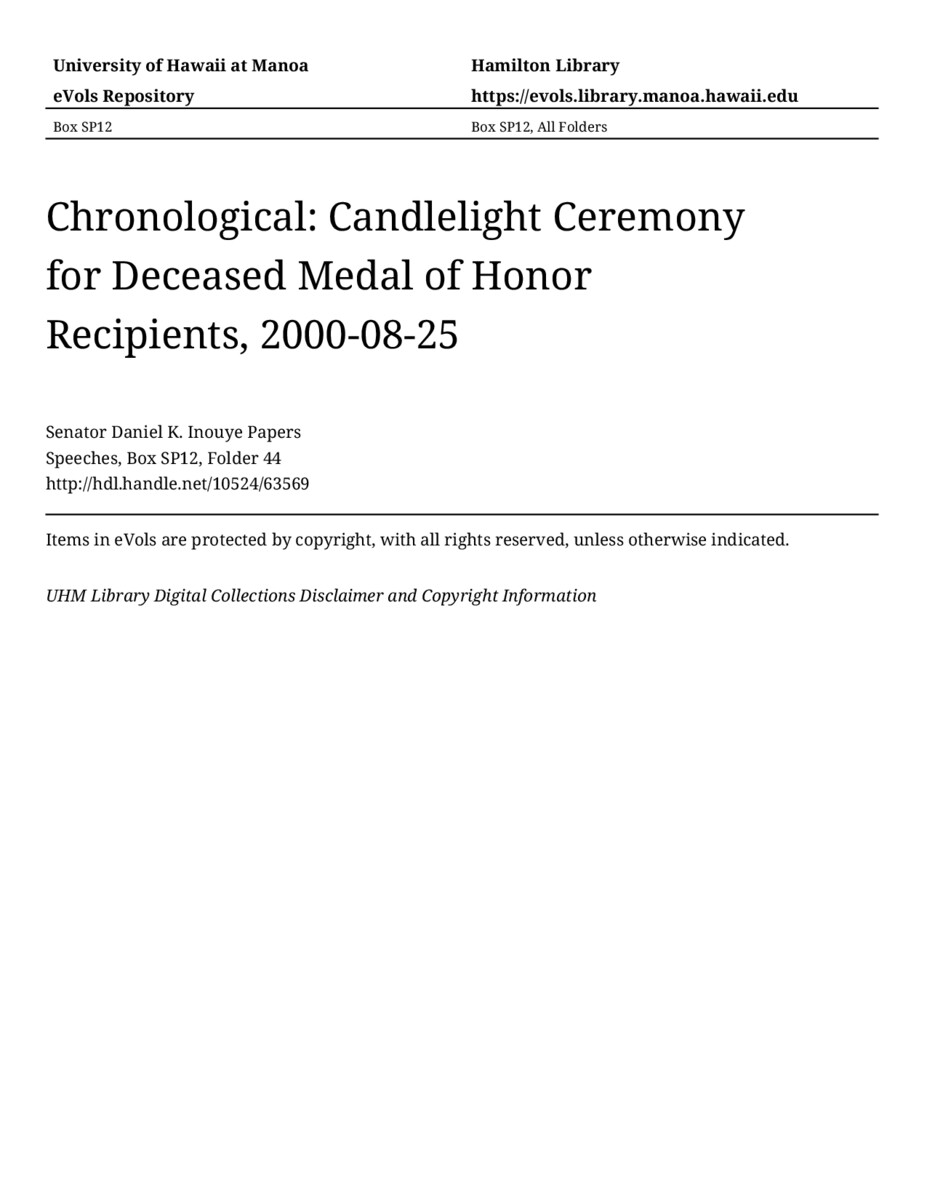 Candlelight Ceremony for Deceased Medal of Honor Recipients, August 25, 2000, MANUSCRIPT-HCPC00011, Speeches, Chronological, Box SP12, Folder 44, Senator Daniel K. Inouye Papers, Hawaiʻi Congressional Papers Collection, University of Hawaiʻi at Mānoa Library, Honolulu, HI. https://omekas-congress.lib.wvu.edu/catalog/10524_63569 (accessed April 17, 2026).