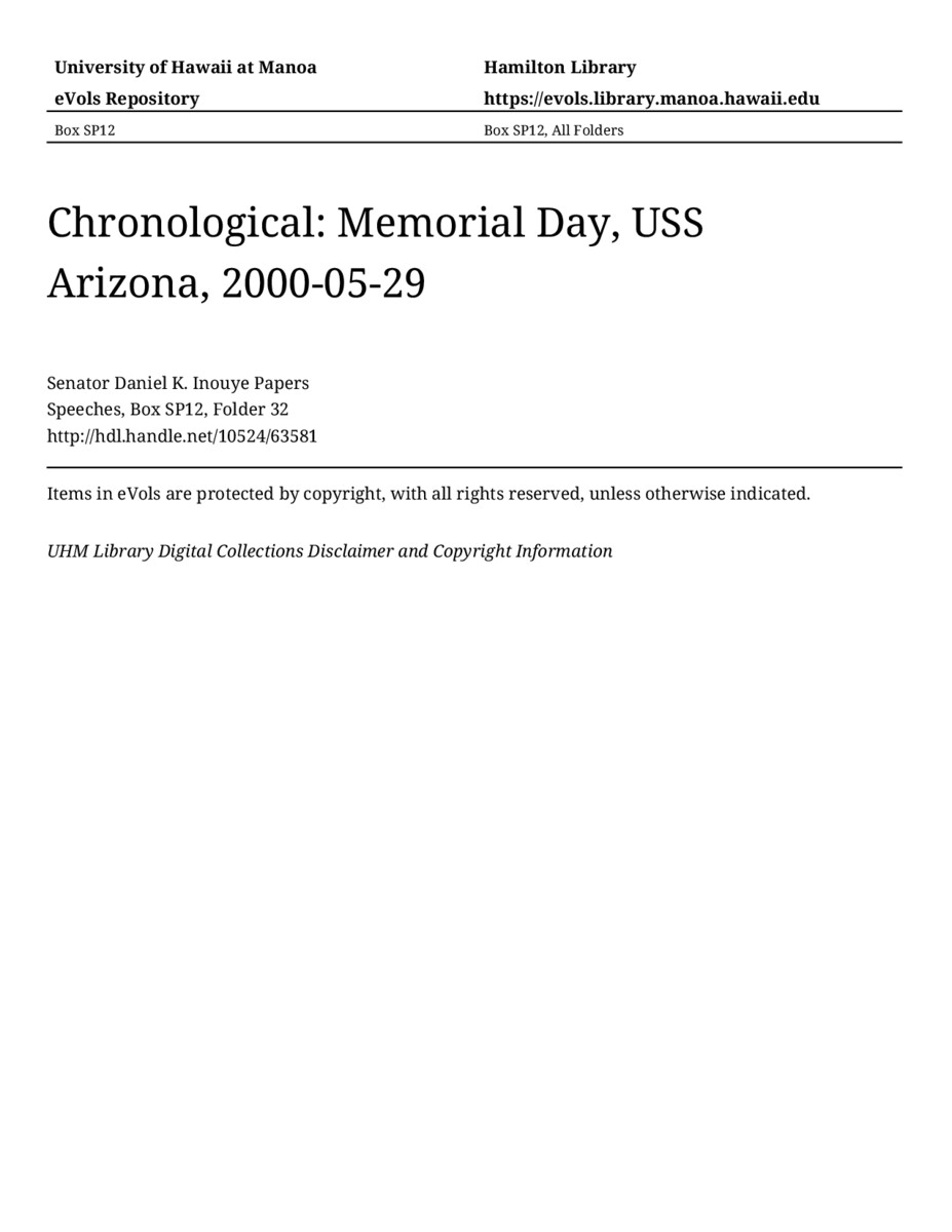 Memorial Day, USS Arizona, May 29, 2000, MANUSCRIPT-HCPC00011, Speeches, Chronological, Box SP12, Folder 32, Senator Daniel K. Inouye Papers, Hawaiʻi Congressional Papers Collection, University of Hawaiʻi at Mānoa Library, Honolulu, HI. https://omekas-congress.lib.wvu.edu/catalog/10524_63581 (accessed April 15, 2026).
