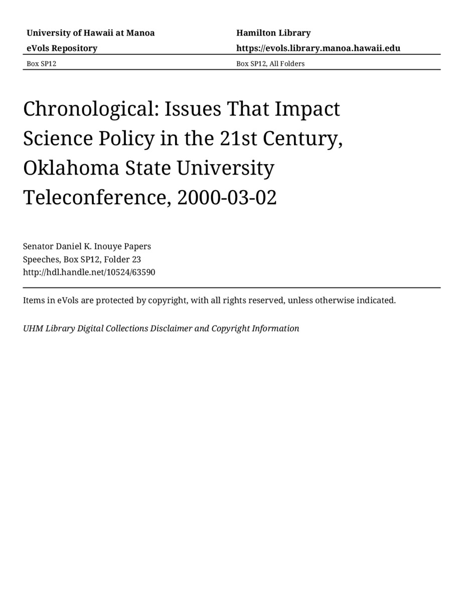 - Issues That Impact Science Policy in the 21st Century, Oklahoma State University Teleconference