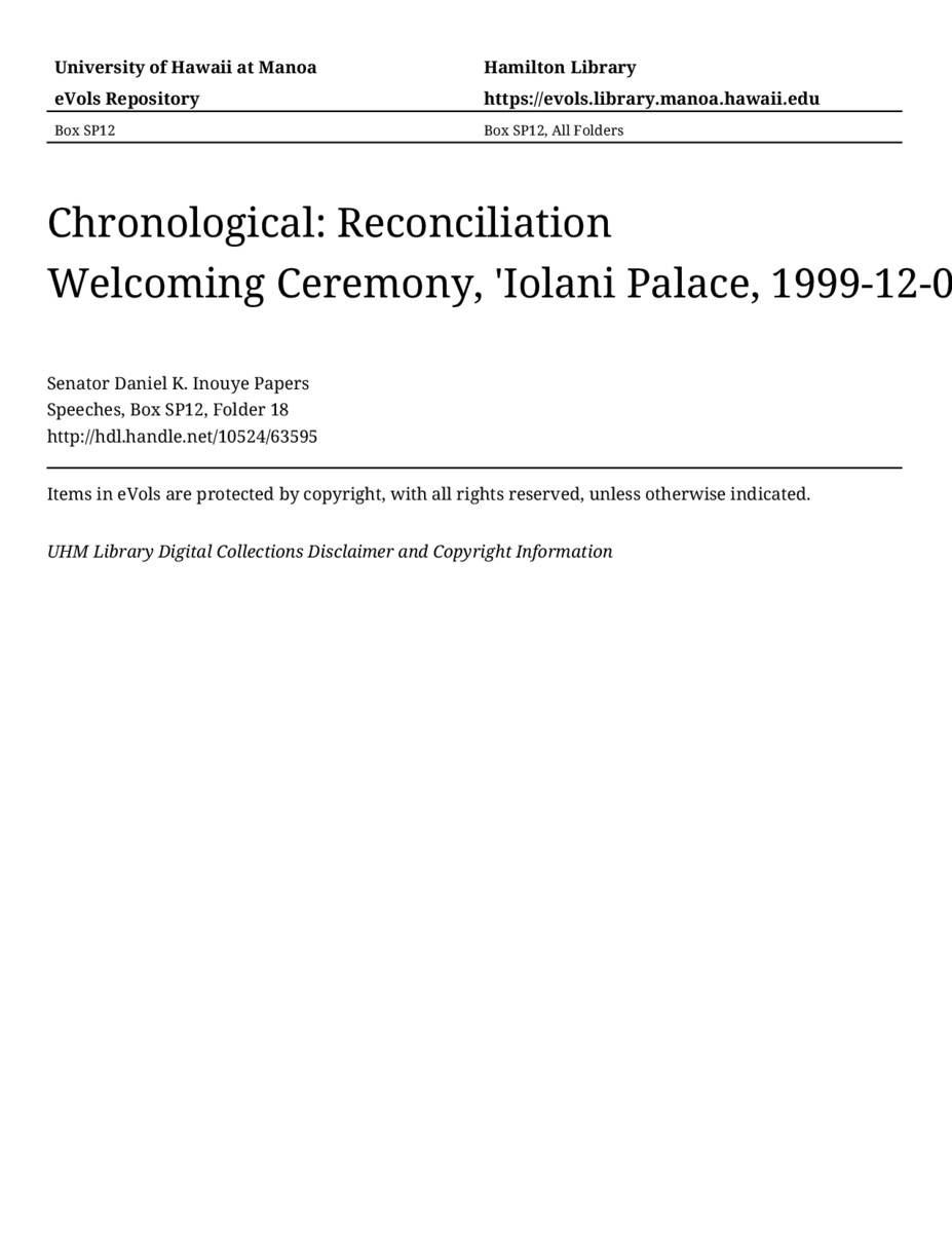 Reconciliation Welcoming Ceremony, 'Iolani Palace, December 4, 1999, MANUSCRIPT-HCPC00011, Speeches, Chronological, Box SP12, Folder 18, Senator Daniel K. Inouye Papers, Hawaiʻi Congressional Papers Collection, University of Hawaiʻi at Mānoa Library, Honolulu, HI. https://omekas-congress.lib.wvu.edu/catalog/10524_63595 (accessed April 17, 2026).