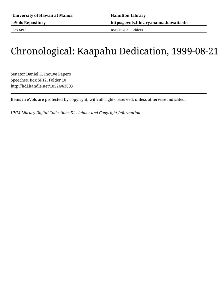 Kaapahu Dedication, August 21, 1999, MANUSCRIPT-HCPC00011, Speeches, Chronological, Box SP12, Folder 10, Senator Daniel K. Inouye Papers, Hawaiʻi Congressional Papers Collection, University of Hawaiʻi at Mānoa Library, Honolulu, HI. https://omekas-congress.lib.wvu.edu/catalog/10524_63603 (accessed April 10, 2026).