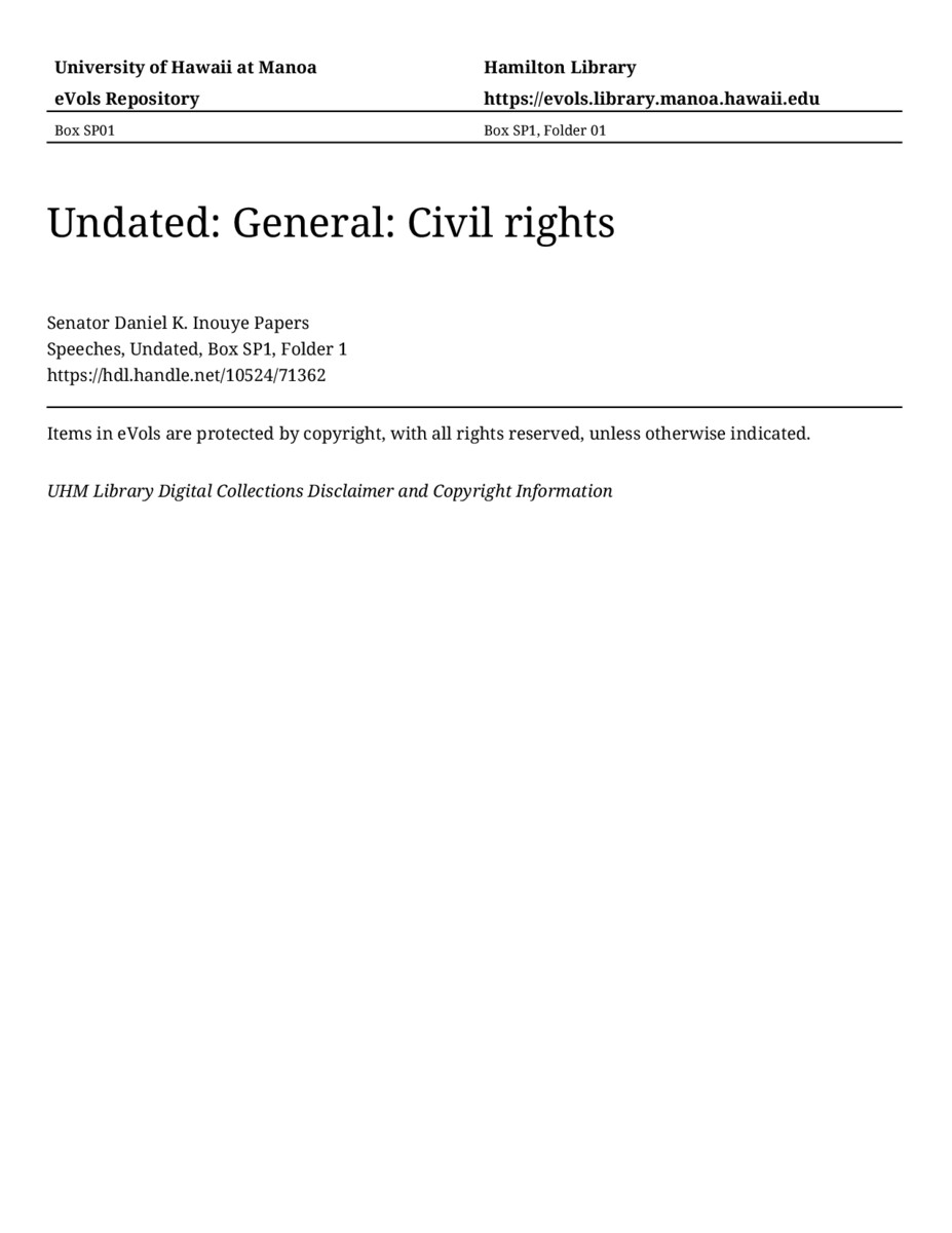 Civil rights, approximately 1963-1964, MANUSCRIPT-HCPC00011, Speeches, Undated, Box SP1, Folder 1, Senator Daniel K. Inouye Papers, Hawaiʻi Congressional Papers Collection, University of Hawaiʻi at Mānoa Library, Honolulu, HI. https://omekas-congress.lib.wvu.edu/catalog/10524_71362 (accessed April 10, 2026).