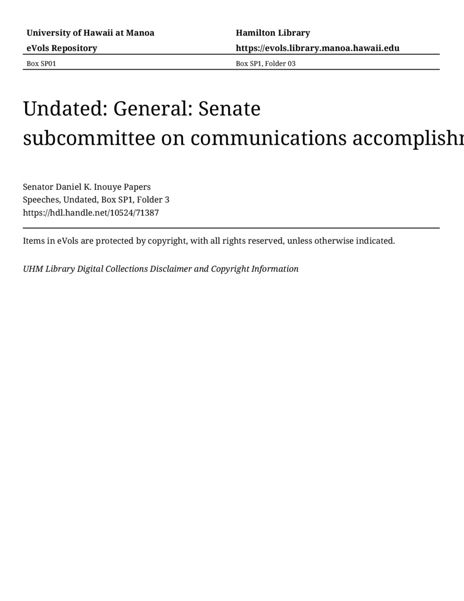 Senate subcommittee on communications accomplishments, 1993, MANUSCRIPT-HCPC00011, Speeches, Undated, Box SP1, Folder 3, Senator Daniel K. Inouye Papers, Hawaiʻi Congressional Papers Collection, University of Hawaiʻi at Mānoa Library, Honolulu, HI. https://omekas-congress.lib.wvu.edu/catalog/10524_71387 (accessed April 09, 2026).