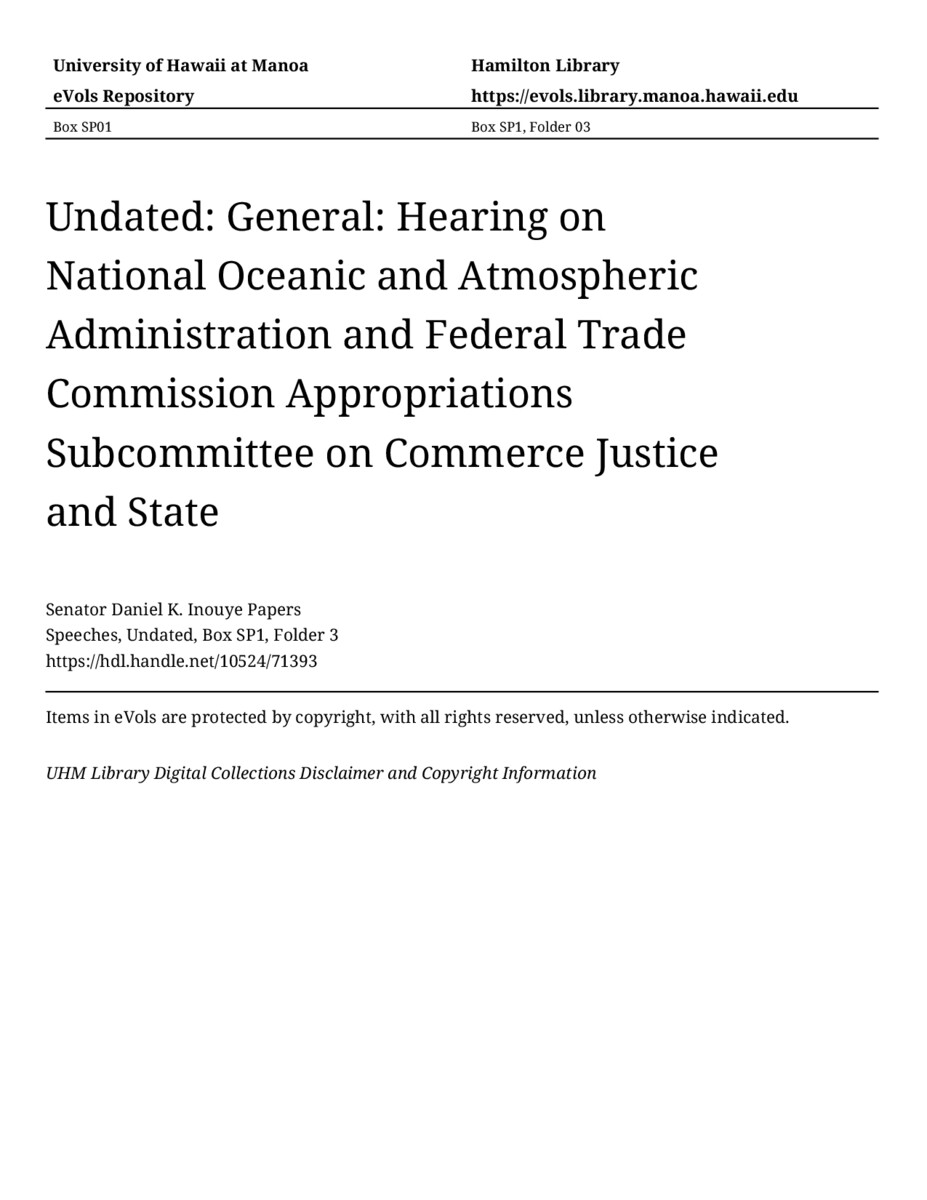 Hearing on National Oceanic and Atmospheric Administration and Federal Trade Commission Appropriations Subcommittee on Commerce Justice and State, approximately 2003-2005, MANUSCRIPT-HCPC00011, Speeches, Undated, Box SP1, Folder 3, Senator Daniel K. Inouye Papers, Hawaiʻi Congressional Papers Collection, University of Hawaiʻi at Mānoa Library, Honolulu, HI. https://omekas-congress.lib.wvu.edu/catalog/10524_71393 (accessed April 18, 2026).