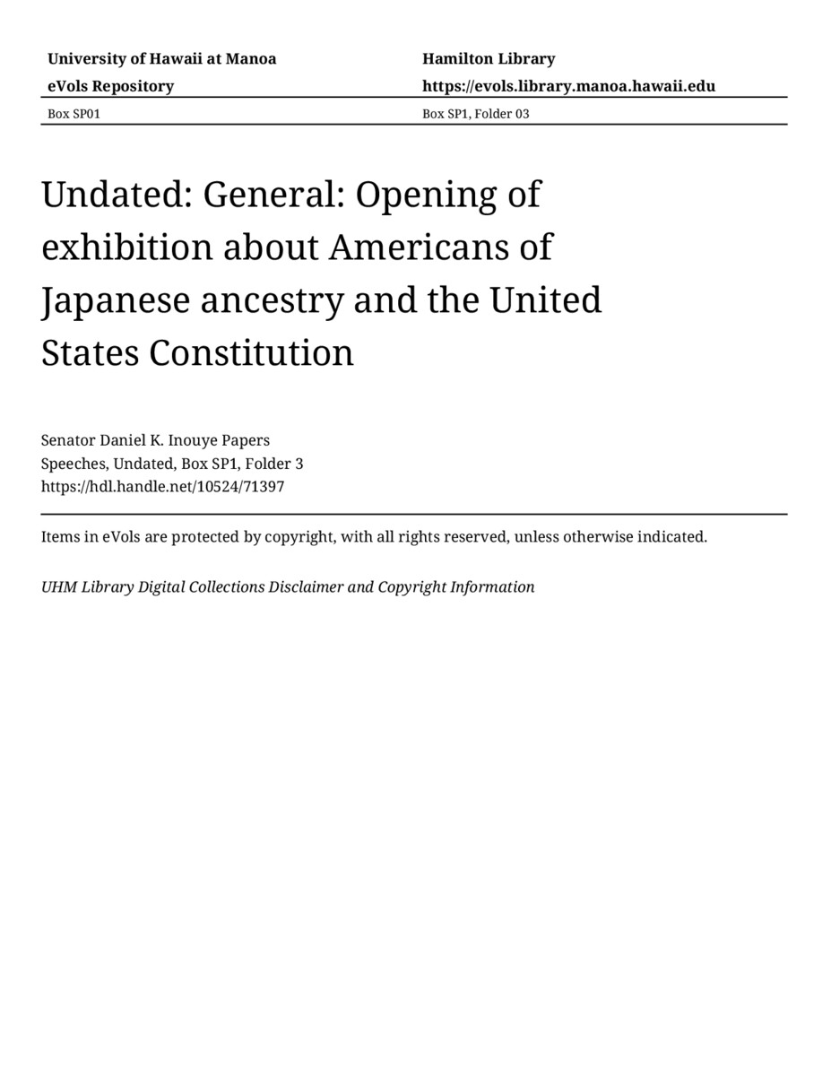 - Opening of exhibition about Americans of Japanese ancestry and the United States Constitution