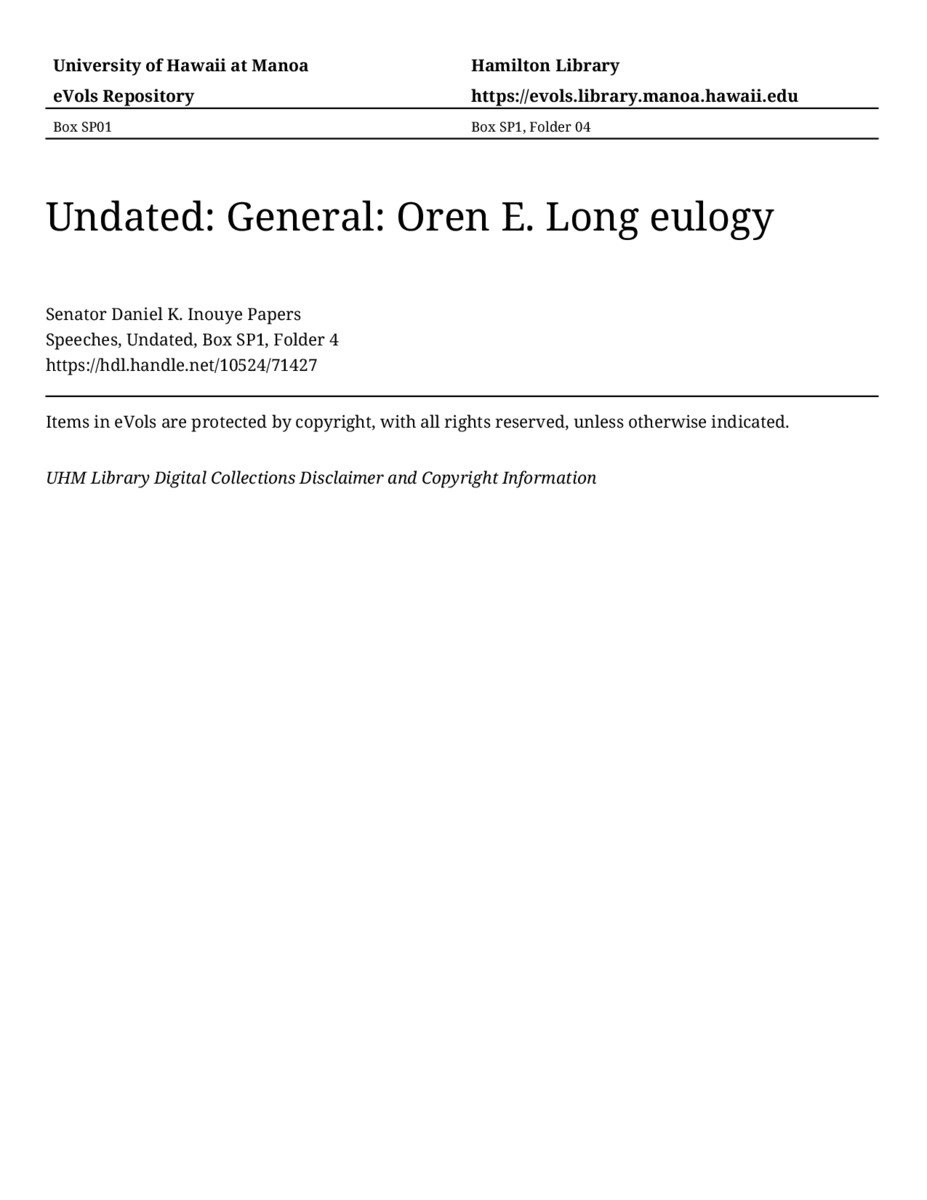 Oren E. Long eulogy, 1965, MANUSCRIPT-HCPC00011, Speeches, Undated, Box SP1, Folder 4, Senator Daniel K. Inouye Papers, Hawaiʻi Congressional Papers Collection, University of Hawaiʻi at Mānoa Library, Honolulu, HI. https://omekas-congress.lib.wvu.edu/catalog/10524_71427 (accessed April 19, 2026).