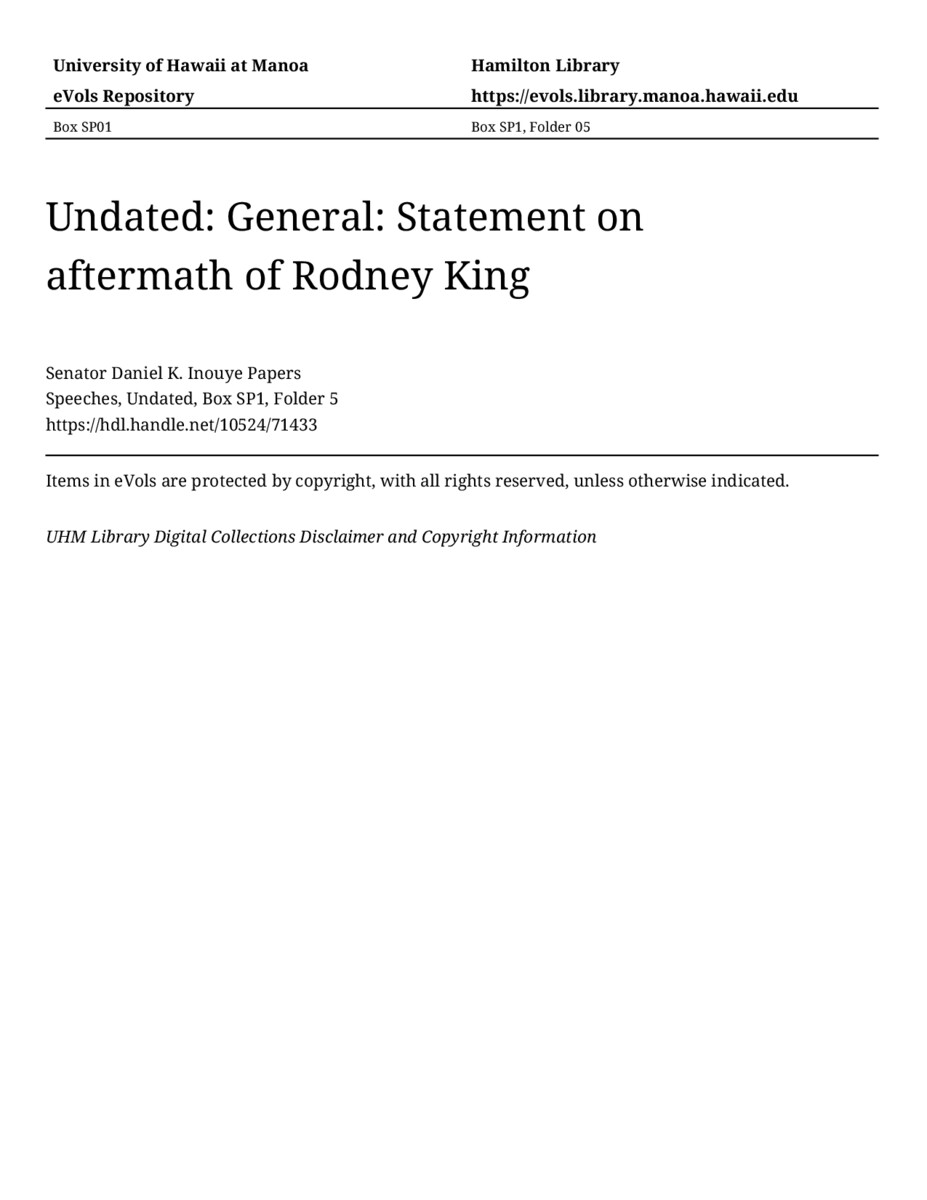 Statement on aftermath of Rodney King, 1992-1993, MANUSCRIPT-HCPC00011, Speeches, Undated, Box SP1, Folder 5, Senator Daniel K. Inouye Papers, Hawaiʻi Congressional Papers Collection, University of Hawaiʻi at Mānoa Library, Honolulu, HI. https://omekas-congress.lib.wvu.edu/catalog/10524_71433 (accessed April 18, 2026).