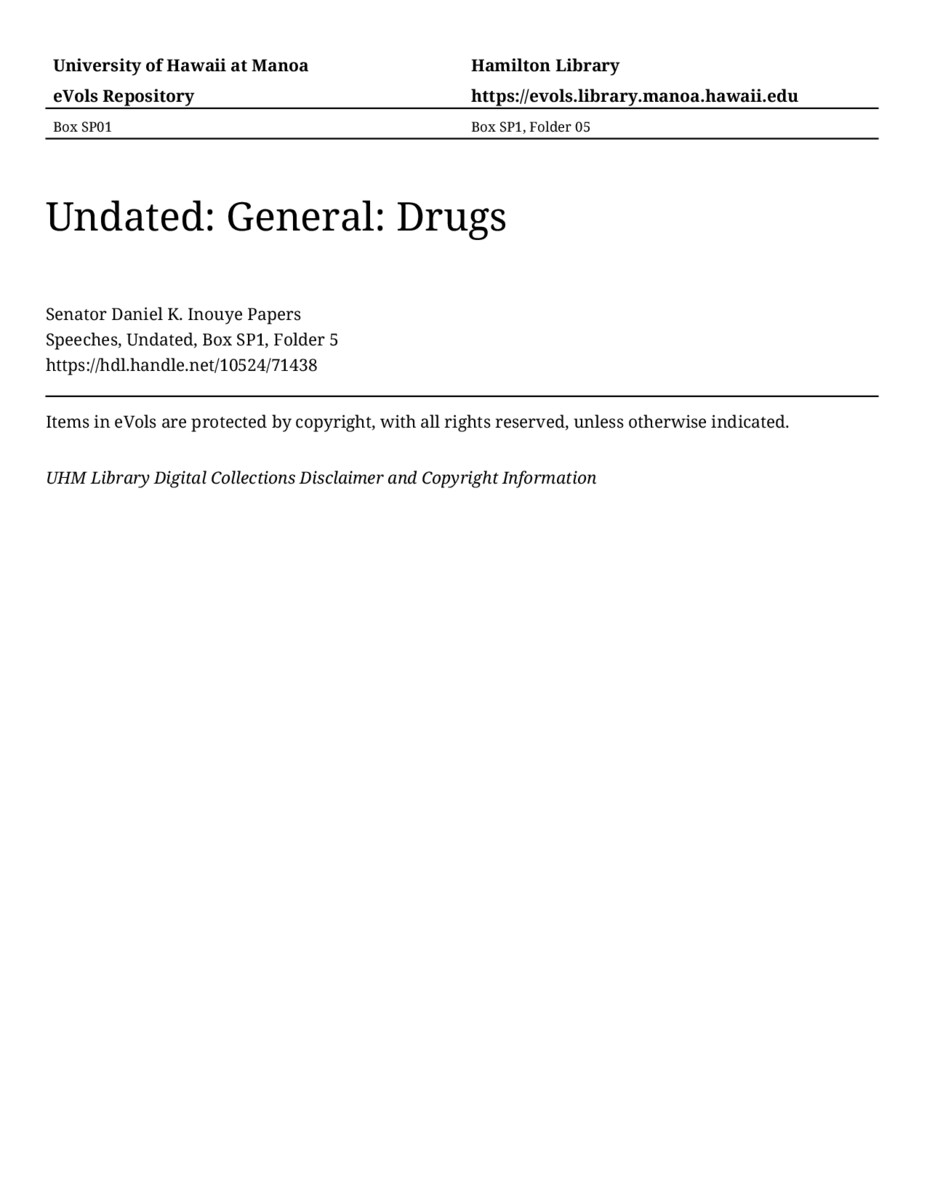 Drugs, Undated, MANUSCRIPT-HCPC00011, Speeches, Undated, Box SP1, Folder 5, Senator Daniel K. Inouye Papers, Hawaiʻi Congressional Papers Collection, University of Hawaiʻi at Mānoa Library, Honolulu, HI. https://omekas-congress.lib.wvu.edu/catalog/10524_71438 (accessed April 10, 2026).