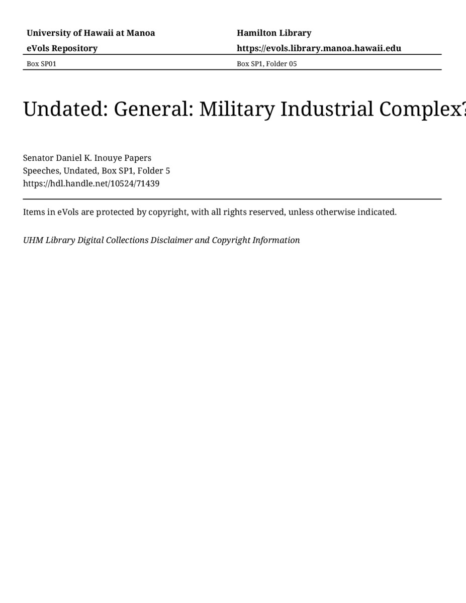 Military Industrial Complex?, 1969, MANUSCRIPT-HCPC00011, Speeches, Undated, Box SP1, Folder 5, Senator Daniel K. Inouye Papers, Hawaiʻi Congressional Papers Collection, University of Hawaiʻi at Mānoa Library, Honolulu, HI. https://omekas-congress.lib.wvu.edu/catalog/10524_71439 (accessed April 12, 2026).