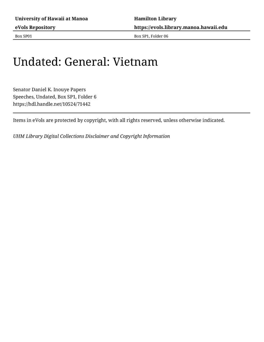 Vietnam, 1969, MANUSCRIPT-HCPC00011, Speeches, Undated, Box SP1, Folder 6, Senator Daniel K. Inouye Papers, Hawaiʻi Congressional Papers Collection, University of Hawaiʻi at Mānoa Library, Honolulu, HI. https://omekas-congress.lib.wvu.edu/catalog/10524_71442 (accessed April 11, 2026).