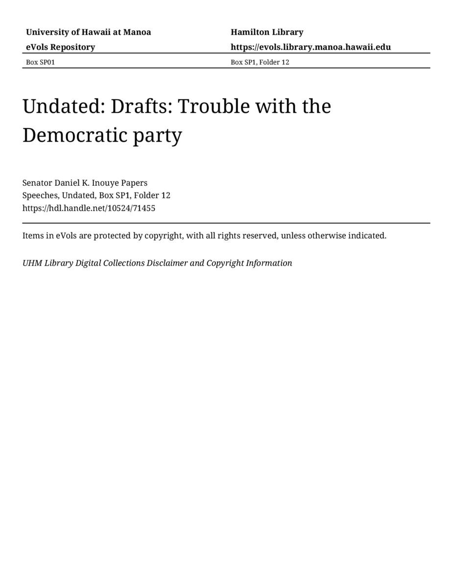 Trouble with the Democratic party, Undated, MANUSCRIPT-HCPC00011, Speeches, Undated, Box SP1, Folder 12, Senator Daniel K. Inouye Papers, Hawaiʻi Congressional Papers Collection, University of Hawaiʻi at Mānoa Library, Honolulu, HI. https://omekas-congress.lib.wvu.edu/catalog/10524_71455 (accessed April 10, 2026).