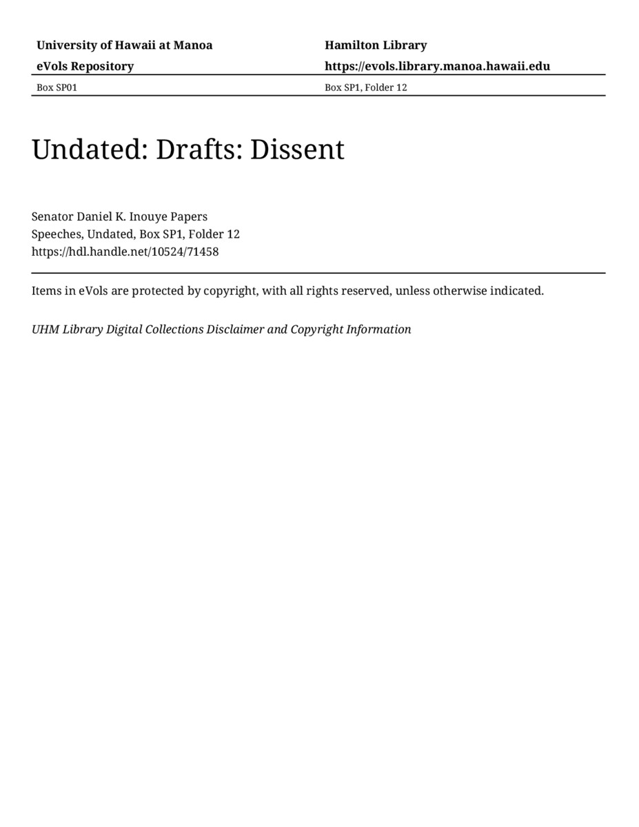 Dissent, 1967, MANUSCRIPT-HCPC00011, Speeches, Undated, Box SP1, Folder 12, Senator Daniel K. Inouye Papers, Hawaiʻi Congressional Papers Collection, University of Hawaiʻi at Mānoa Library, Honolulu, HI. https://omekas-congress.lib.wvu.edu/catalog/10524_71458 (accessed April 10, 2026).
