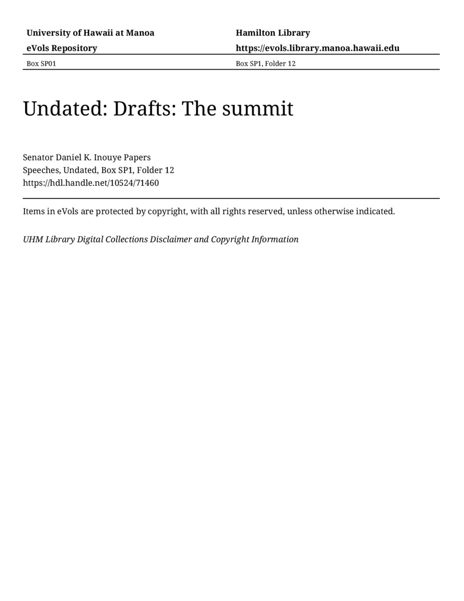 The summit, approximately 1967, MANUSCRIPT-HCPC00011, Speeches, Undated, Box SP1, Folder 12, Senator Daniel K. Inouye Papers, Hawaiʻi Congressional Papers Collection, University of Hawaiʻi at Mānoa Library, Honolulu, HI. https://omekas-congress.lib.wvu.edu/catalog/10524_71460 (accessed April 11, 2026).