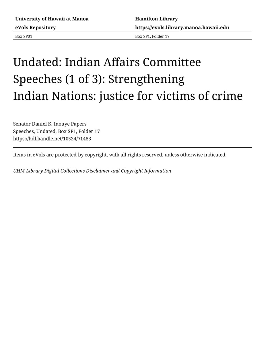 Strengthening Indian Nations: justice for victims of crime, May 11, 1994, MANUSCRIPT-HCPC00011, Speeches, Undated, Box SP1, Folder 17, Senator Daniel K. Inouye Papers, Hawaiʻi Congressional Papers Collection, University of Hawaiʻi at Mānoa Library, Honolulu, HI. https://omekas-congress.lib.wvu.edu/catalog/10524_71483 (accessed April 17, 2026).