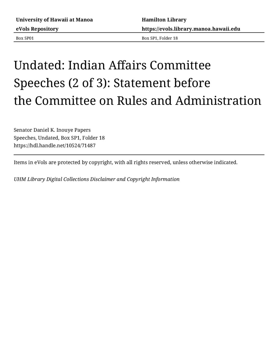 Statement before the Committee on Rules and Administration, February 24, 1994, MANUSCRIPT-HCPC00011, Speeches, Undated, Box SP1, Folder 18, Senator Daniel K. Inouye Papers, Hawaiʻi Congressional Papers Collection, University of Hawaiʻi at Mānoa Library, Honolulu, HI. https://omekas-congress.lib.wvu.edu/catalog/10524_71487 (accessed April 20, 2026).