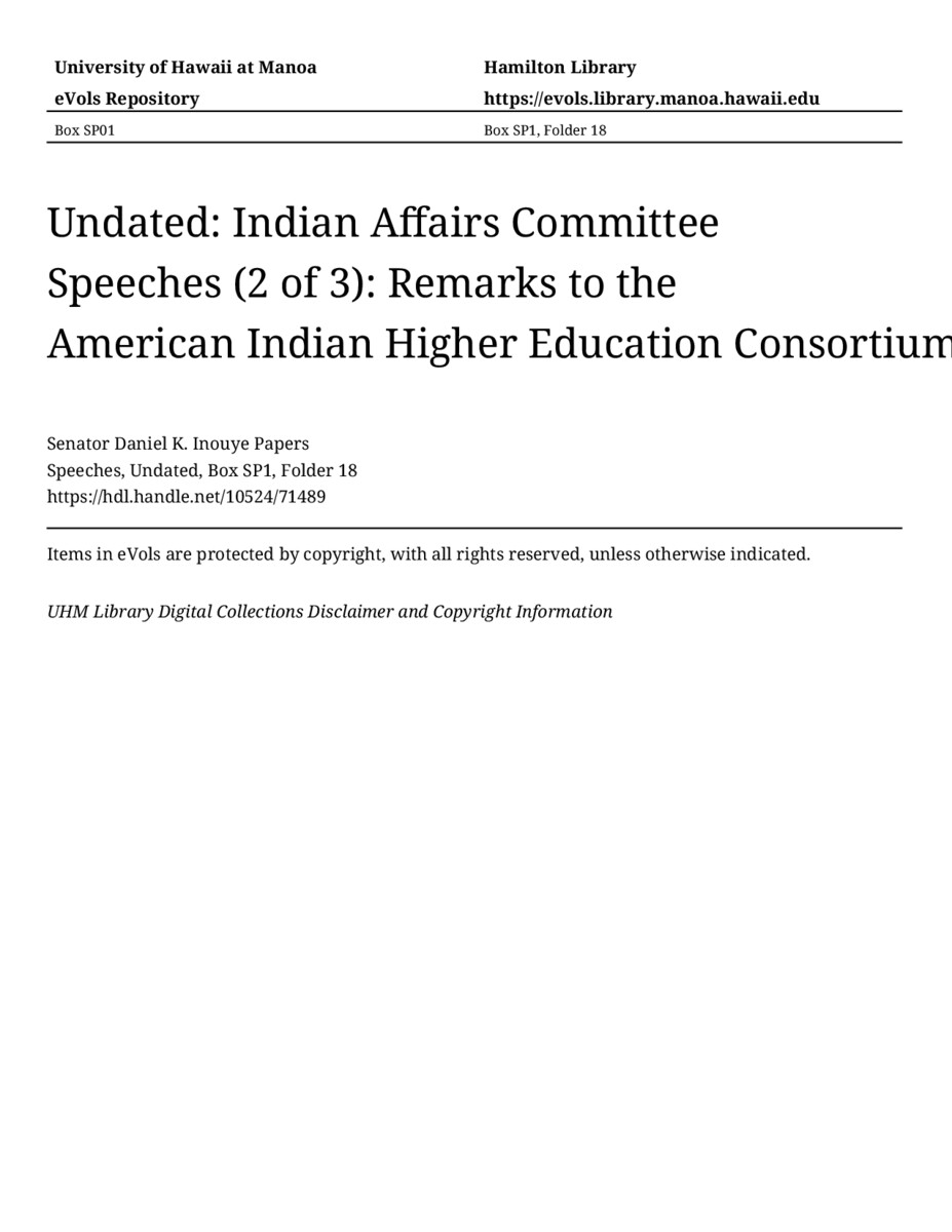 Remarks to the American Indian Higher Education Consortium, February 9, 1994, MANUSCRIPT-HCPC00011, Speeches, Undated, Box SP1, Folder 18, Senator Daniel K. Inouye Papers, Hawaiʻi Congressional Papers Collection, University of Hawaiʻi at Mānoa Library, Honolulu, HI. https://omekas-congress.lib.wvu.edu/catalog/10524_71489 (accessed April 16, 2026).