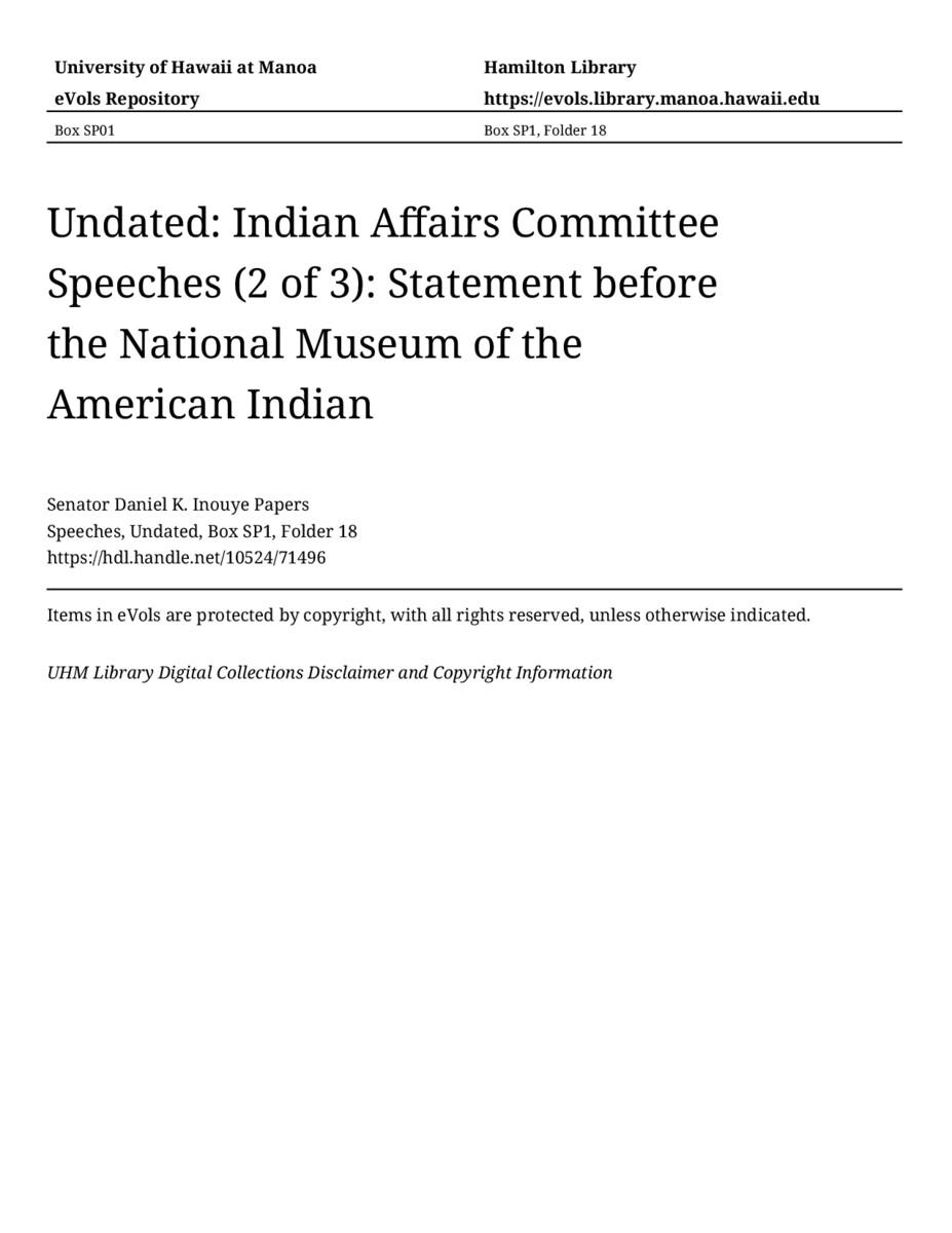 Statement before the National Museum of the American Indian, May 27, 1997, MANUSCRIPT-HCPC00011, Speeches, Undated, Box SP1, Folder 18, Senator Daniel K. Inouye Papers, Hawaiʻi Congressional Papers Collection, University of Hawaiʻi at Mānoa Library, Honolulu, HI. https://omekas-congress.lib.wvu.edu/catalog/10524_71496 (accessed April 16, 2026).